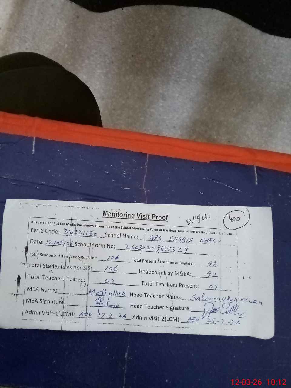 | EMIS Code: 38321180 | Name of School: GPS SHARIF KHEL | |||