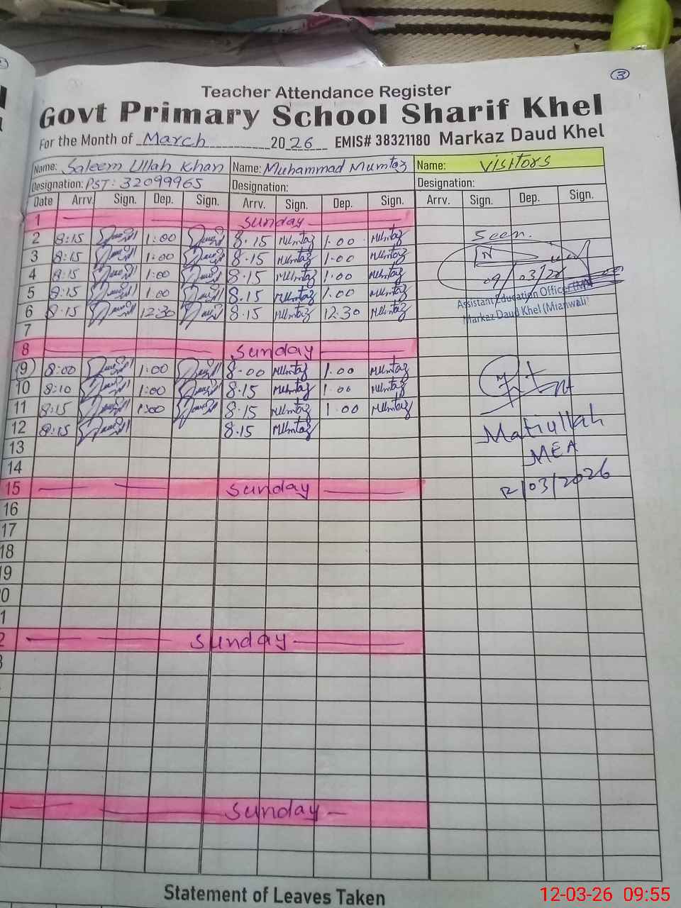 | District: MIANWALI | Tehsil: MIANWALI | Markaz: DAUD KHEL-MALE | Level: Primary | |