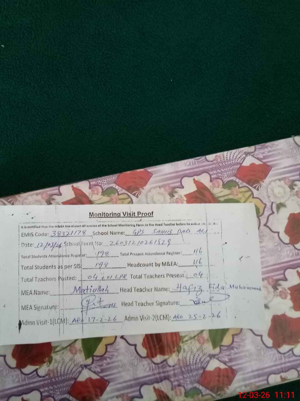 | EMIS Code: 38321178 | Name of School: GPS SAHIB DAD WALI | |||
