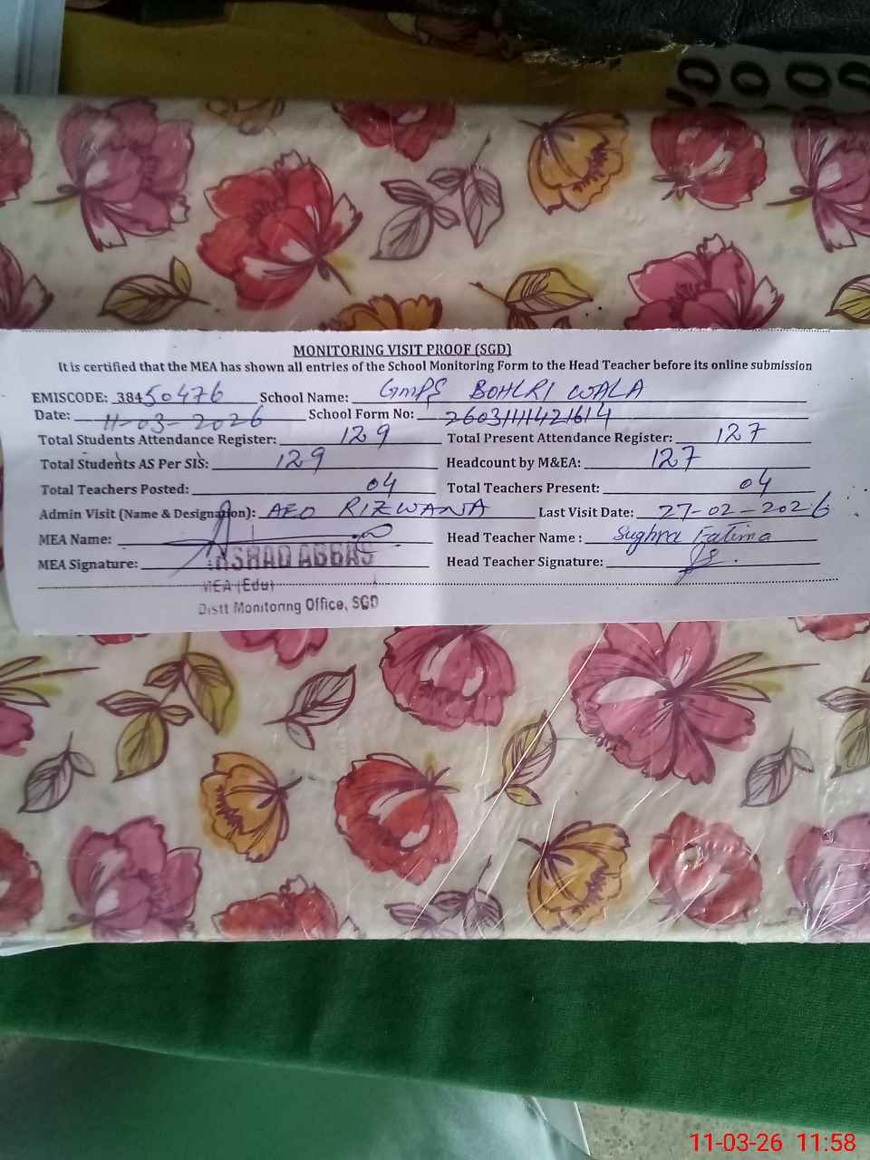 | Attendance Register | Head Teacher | MEA with School | Visit Proof |