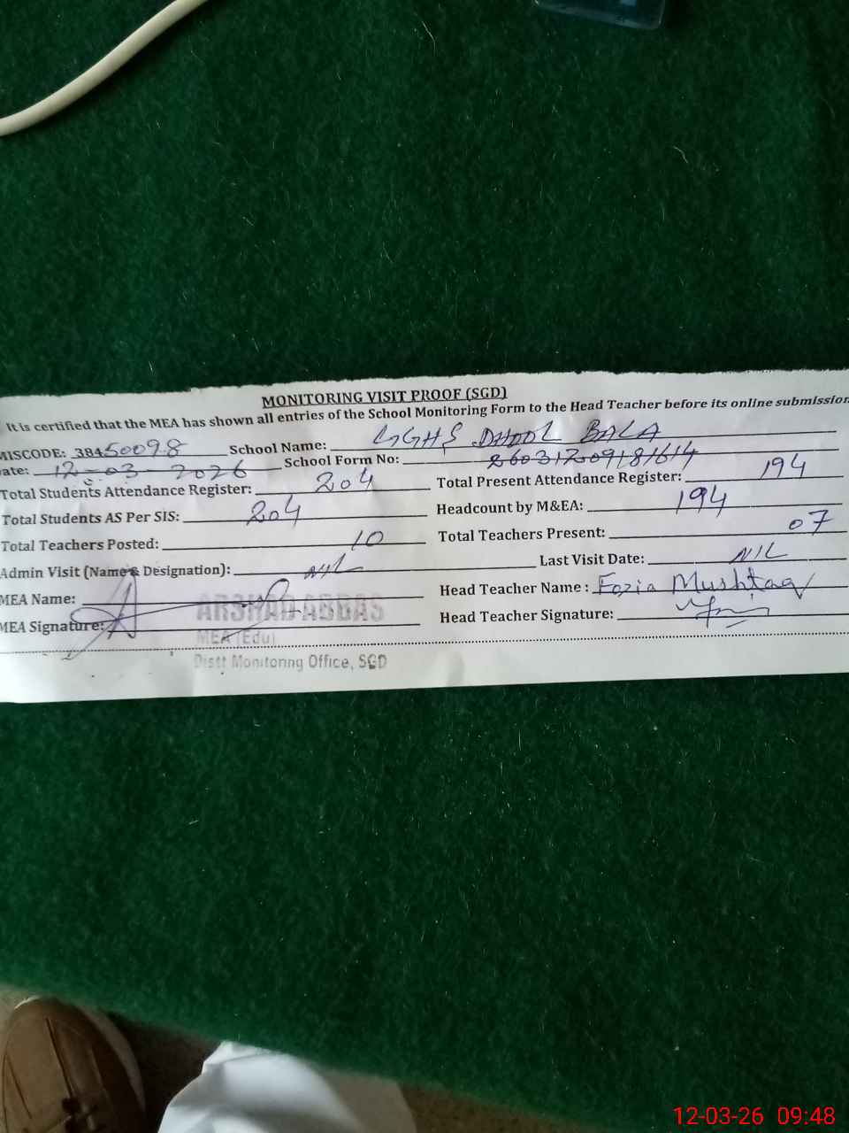 | EMIS Code: 38450098 | Name of School: GGHS DHOOL BALA | |||