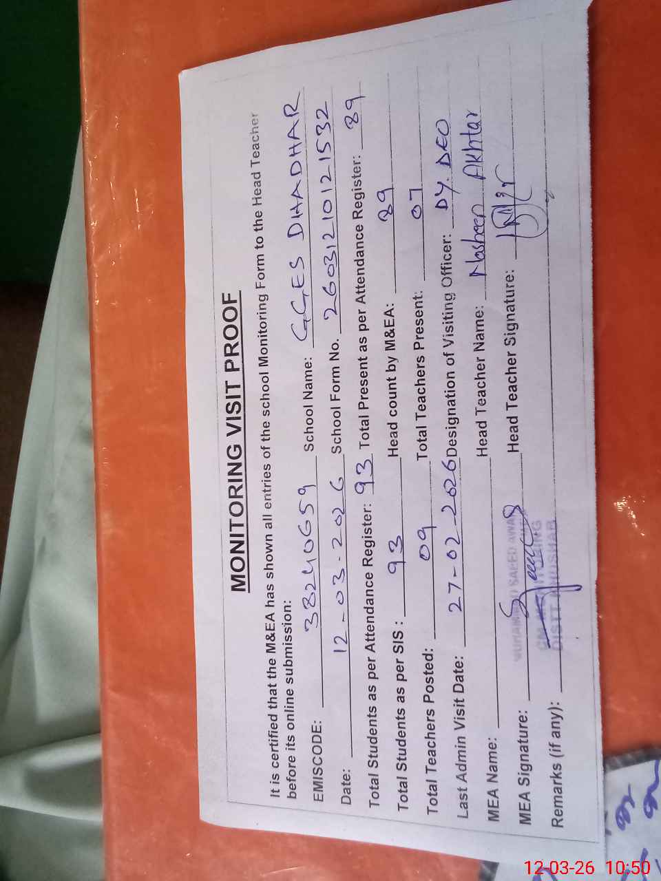 | Remarks (Use Separate Page if Required): Students on SIS QTY 93 Last admin visit 27 February 2026 by Dy.DEO | |||||