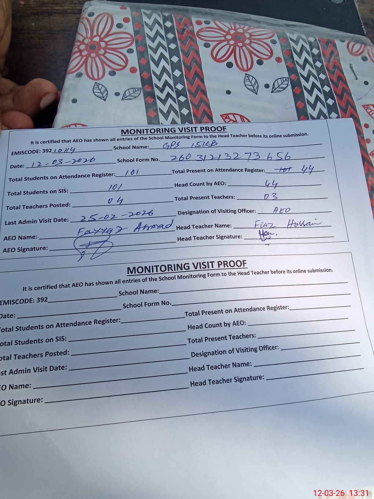 | Monitoring Date: 12-03-2026 | Start Time: 12-03-2026 01:17 PM | End Time: 12-03-2026 01:33 PM | Name of MEA: Fa**** Ah**** | |