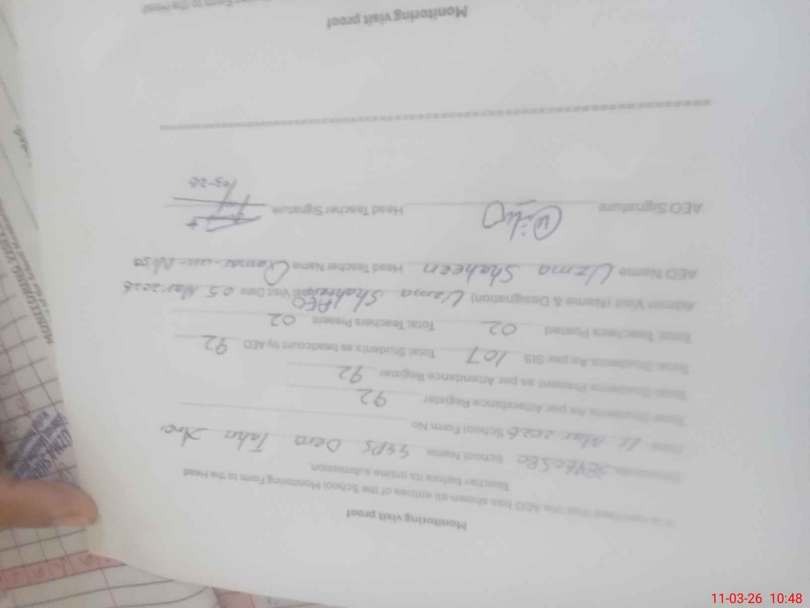 | Attendance Register | Head Teacher | MEA with School | Visit Proof |