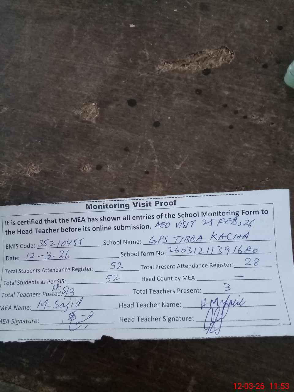 | Attendance Register | Head Teacher | MEA with School | Visit Proof |