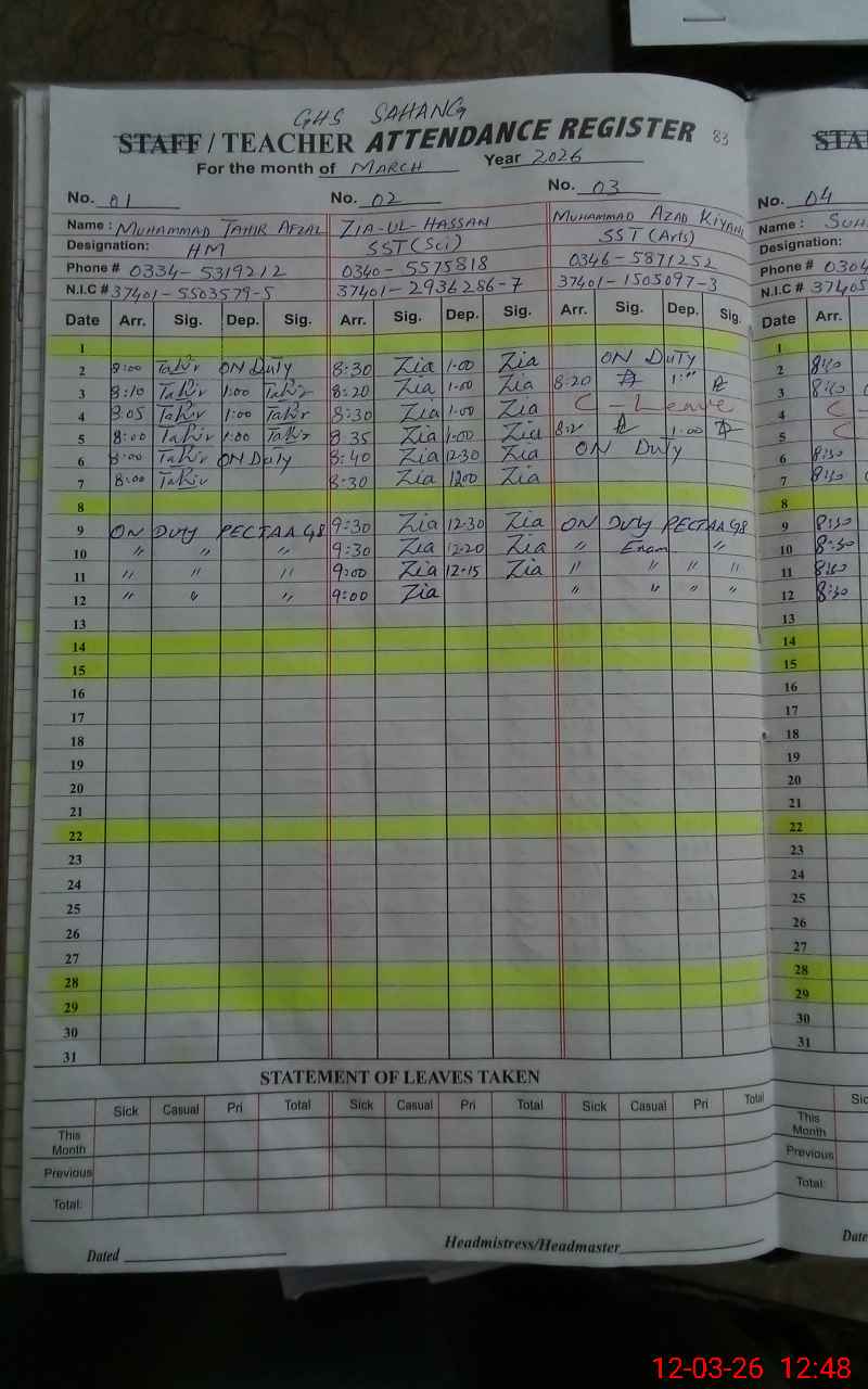 | 37**** | Sh**** Ik**** | PST Arts | Regular | 0 | 0 | 0 | 0 | 0 | 0 | 0 | 0 | 0 | Exam Duty |