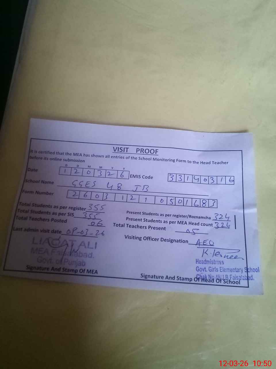 | Attendance Register | Head Teacher | MEA with School | Visit Proof |