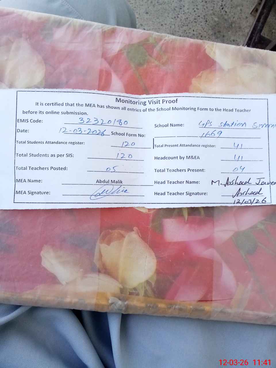 | Attendance Register | Head Teacher | MEA with School | Visit Proof |