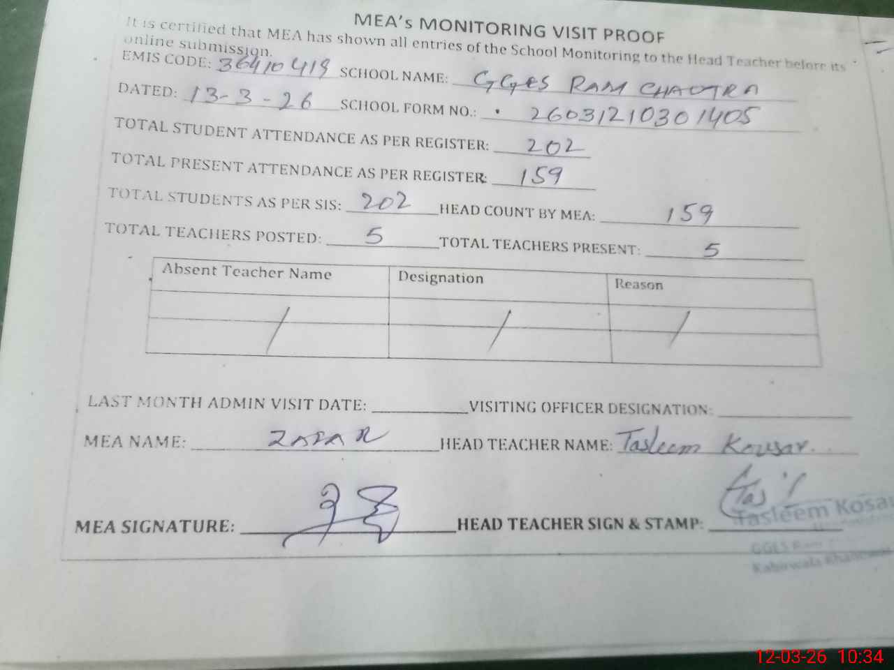 | Attendance Register | Head Teacher | MEA with School | Visit Proof |