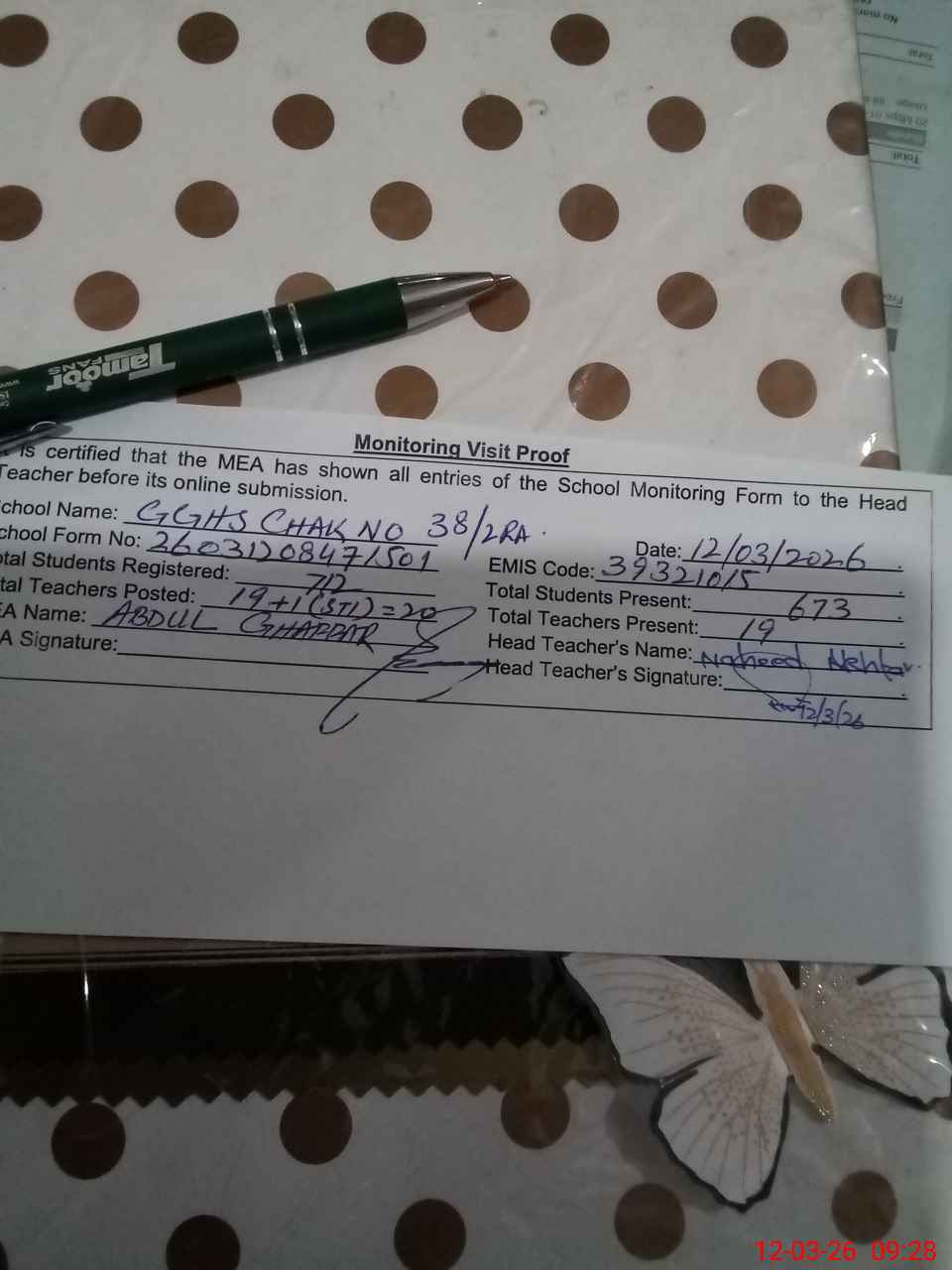 | EMIS Code: 39321015 | Name of School: GGHS CHAK NO. 38/2-RA | |||