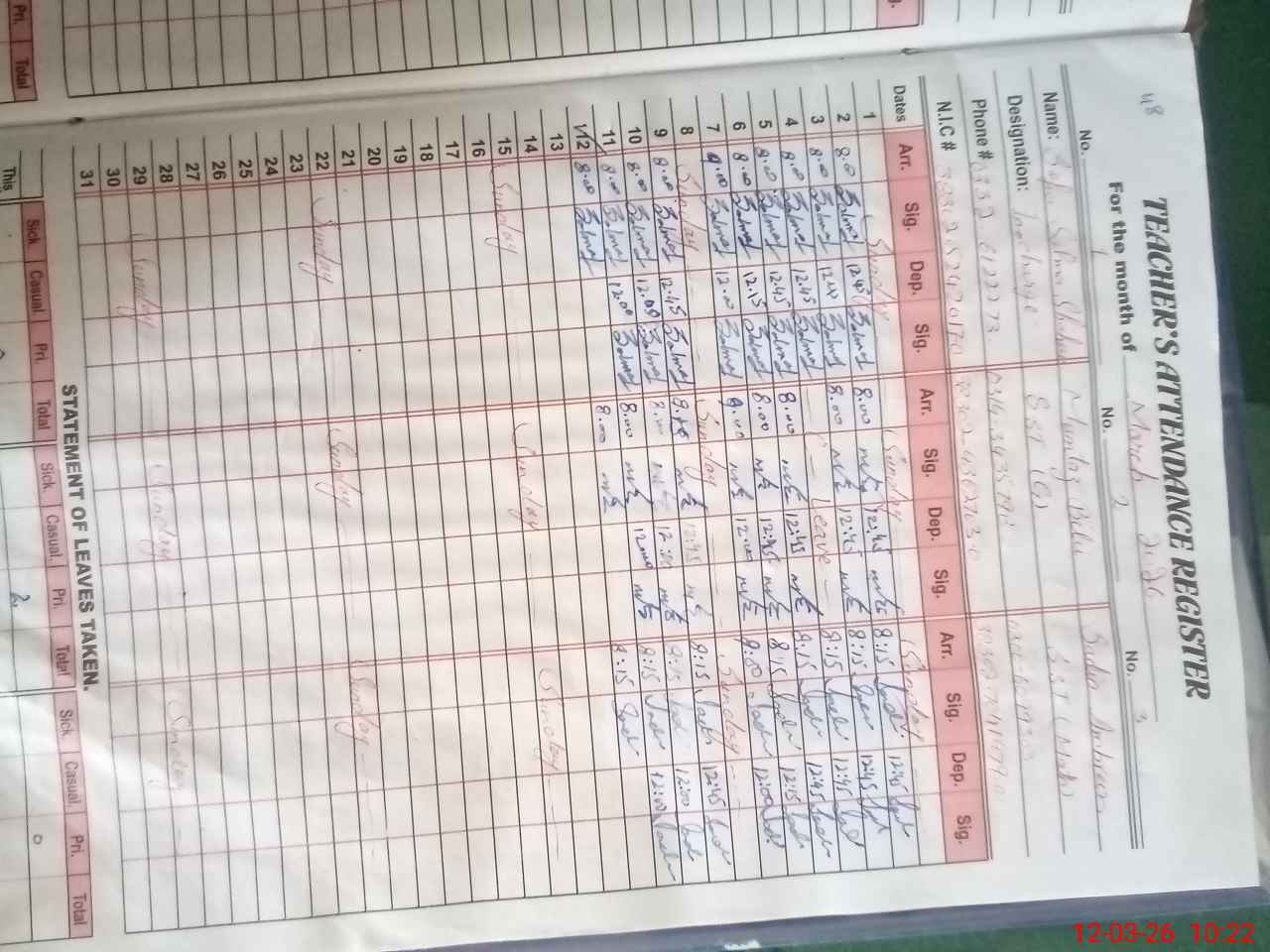 | CNIC | Full Name | Designation | R/C | Absence During Last Calender Month |
