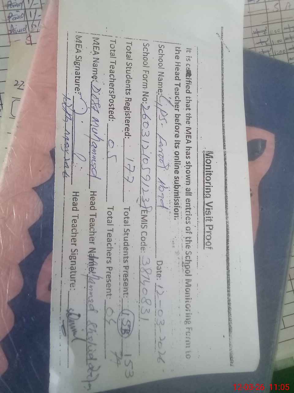 | Attendance Register | Head Teacher | MEA with School | Visit Proof |