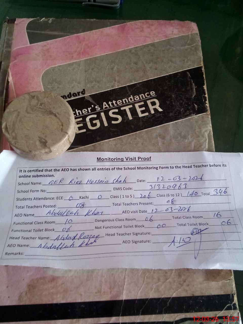 | Attendance Register | Head Teacher | MEA with School | Visit Proof |