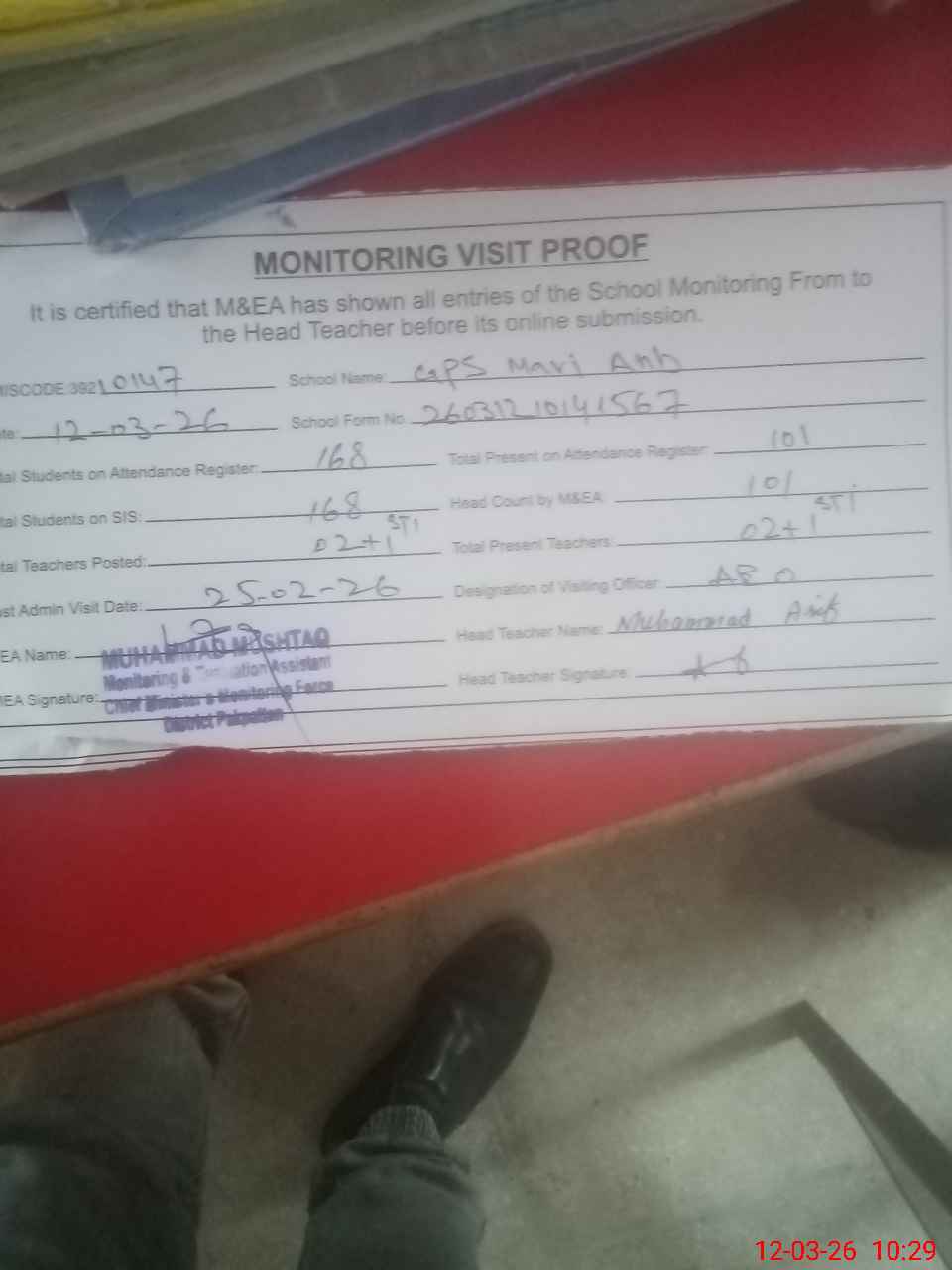 | Attendance Register | Head Teacher | MEA with School | Visit Proof |