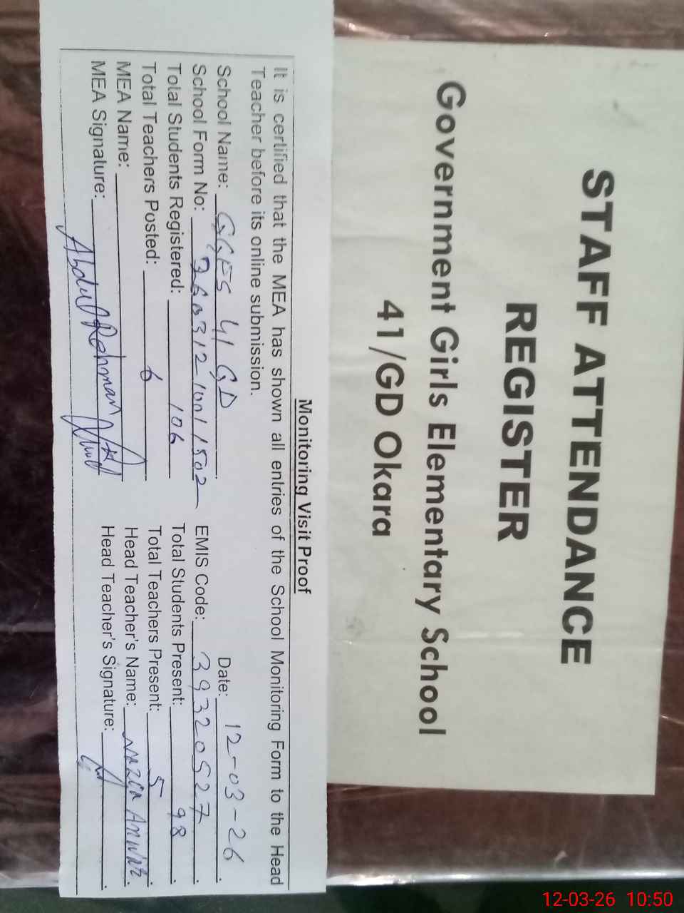 | Attendance Register | Head Teacher | MEA with School | Visit Proof |