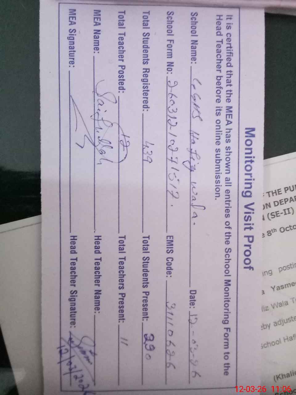 | EMIS Code: 31110626 | Name of School: GGHS HAFIZ WALA | |||