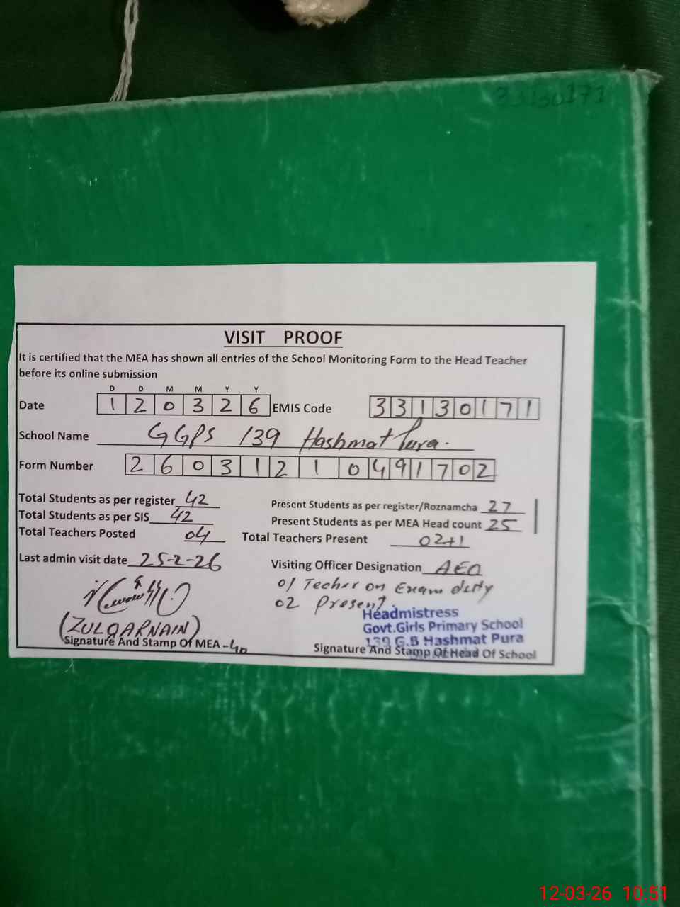 | EMIS Code: 33130171 | Name of School: GGPS CHAK 139 GB II HASHMAT PURA SAMUNDRI | |||