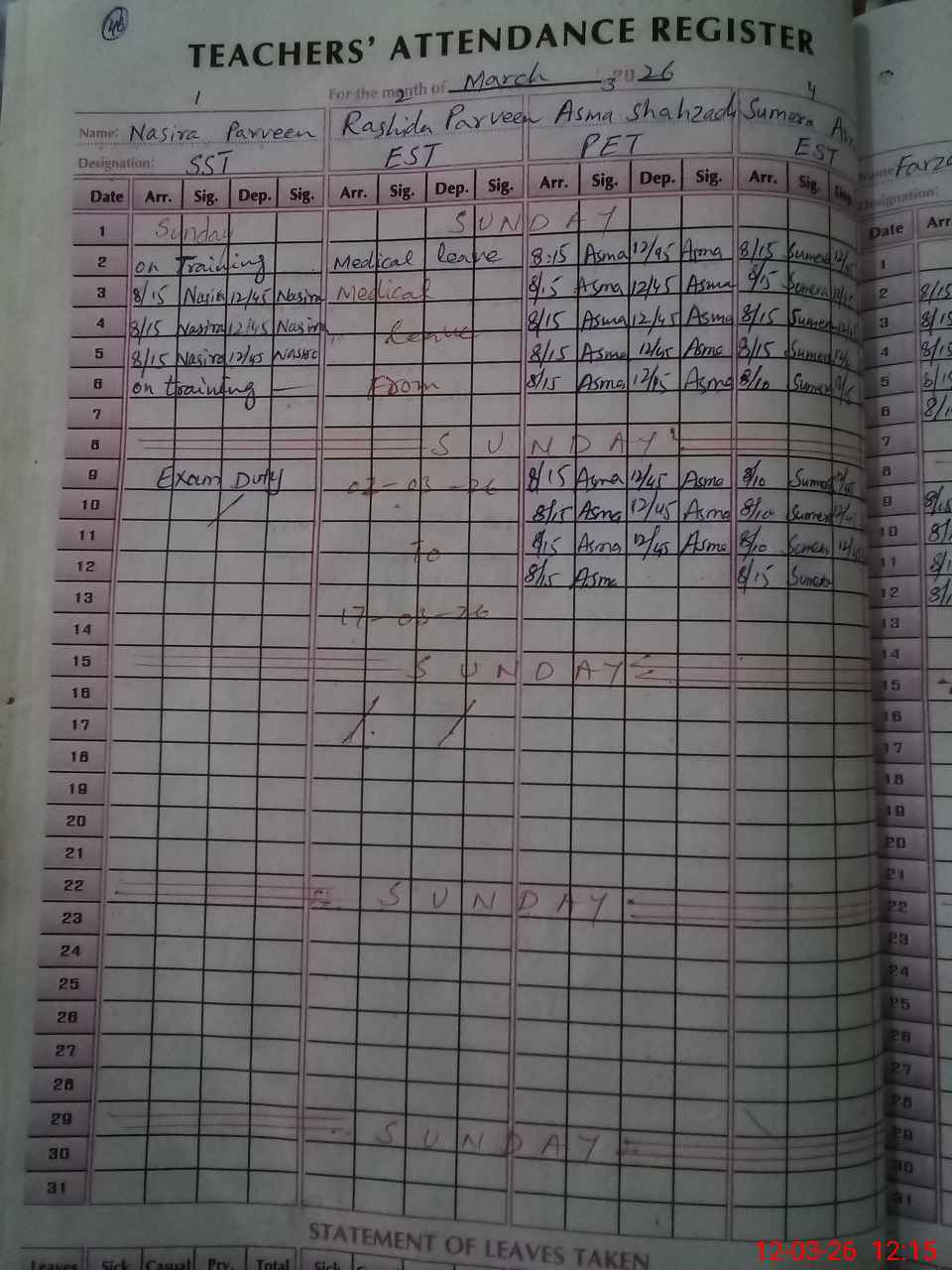 | 33**** | Na**** Pe**** | SST Science | Regular | 0 | 0 | 0 | 0 | 0 | 0 | 0 | 0 | 0 | Exam Duty |