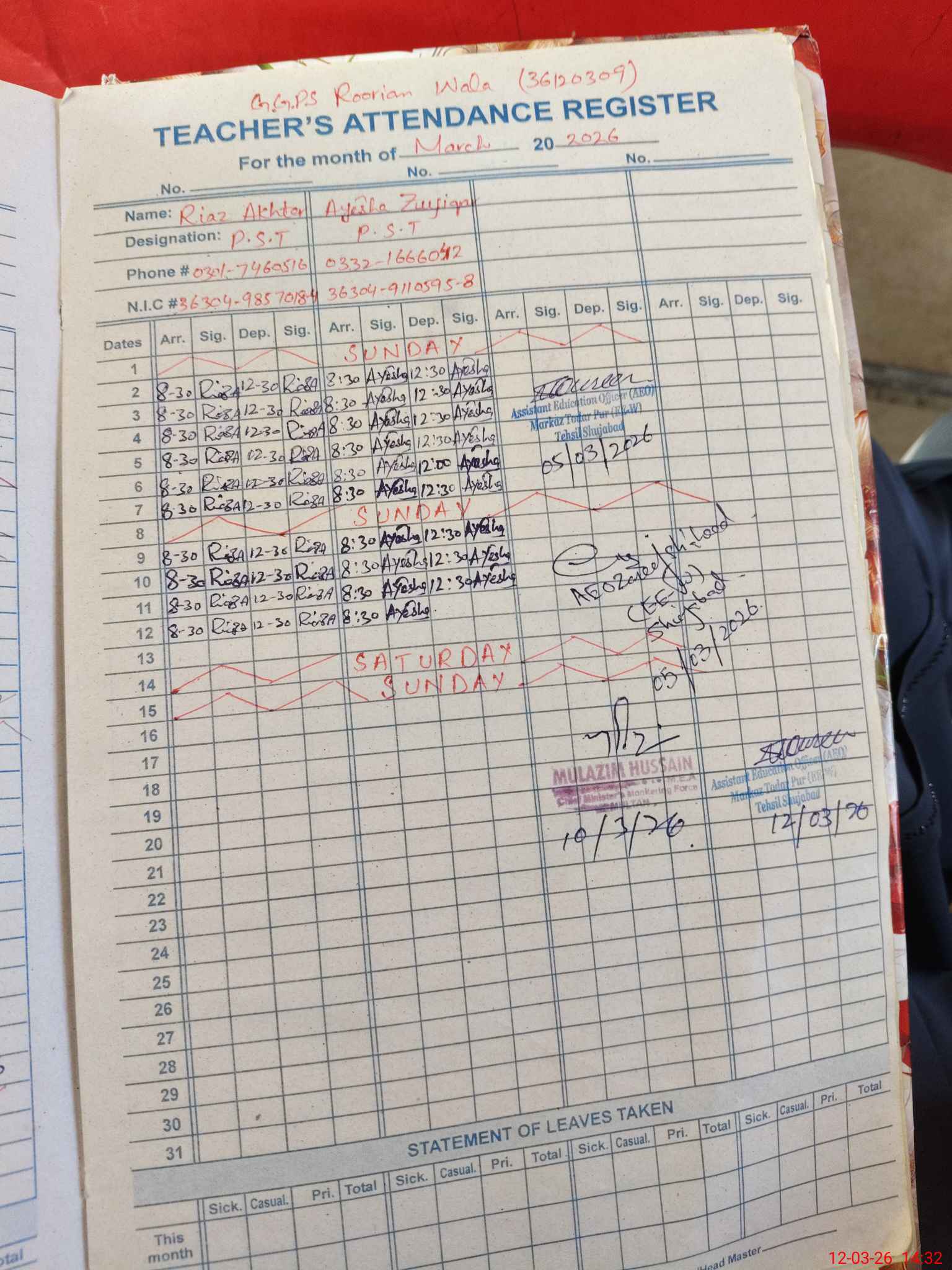 | EMIS Code: 36120309 | Name of School: GGPS ROORIAN WALA SHUJABAD | |||