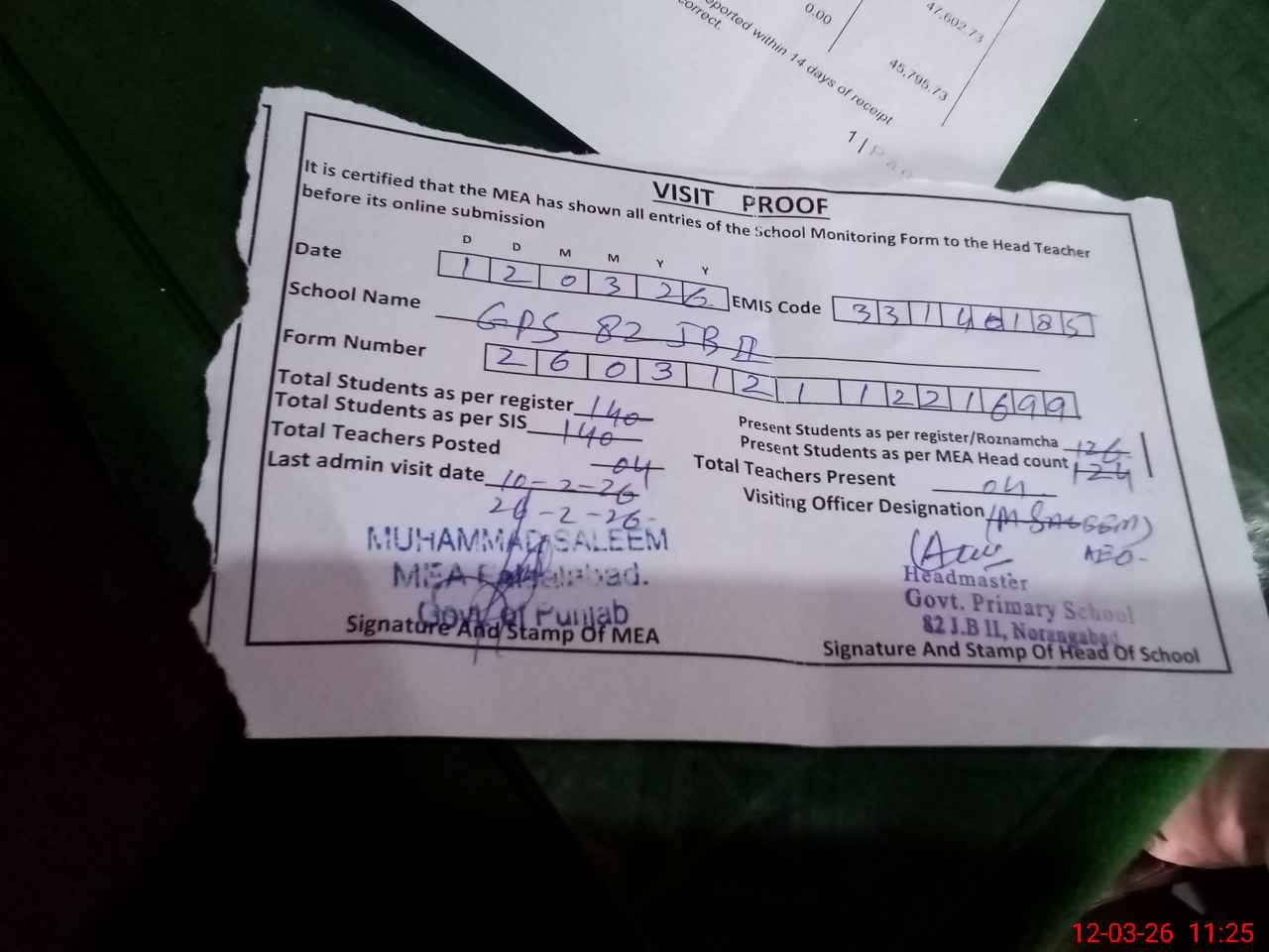 | Attendance Register | Head Teacher | MEA with School | Visit Proof |