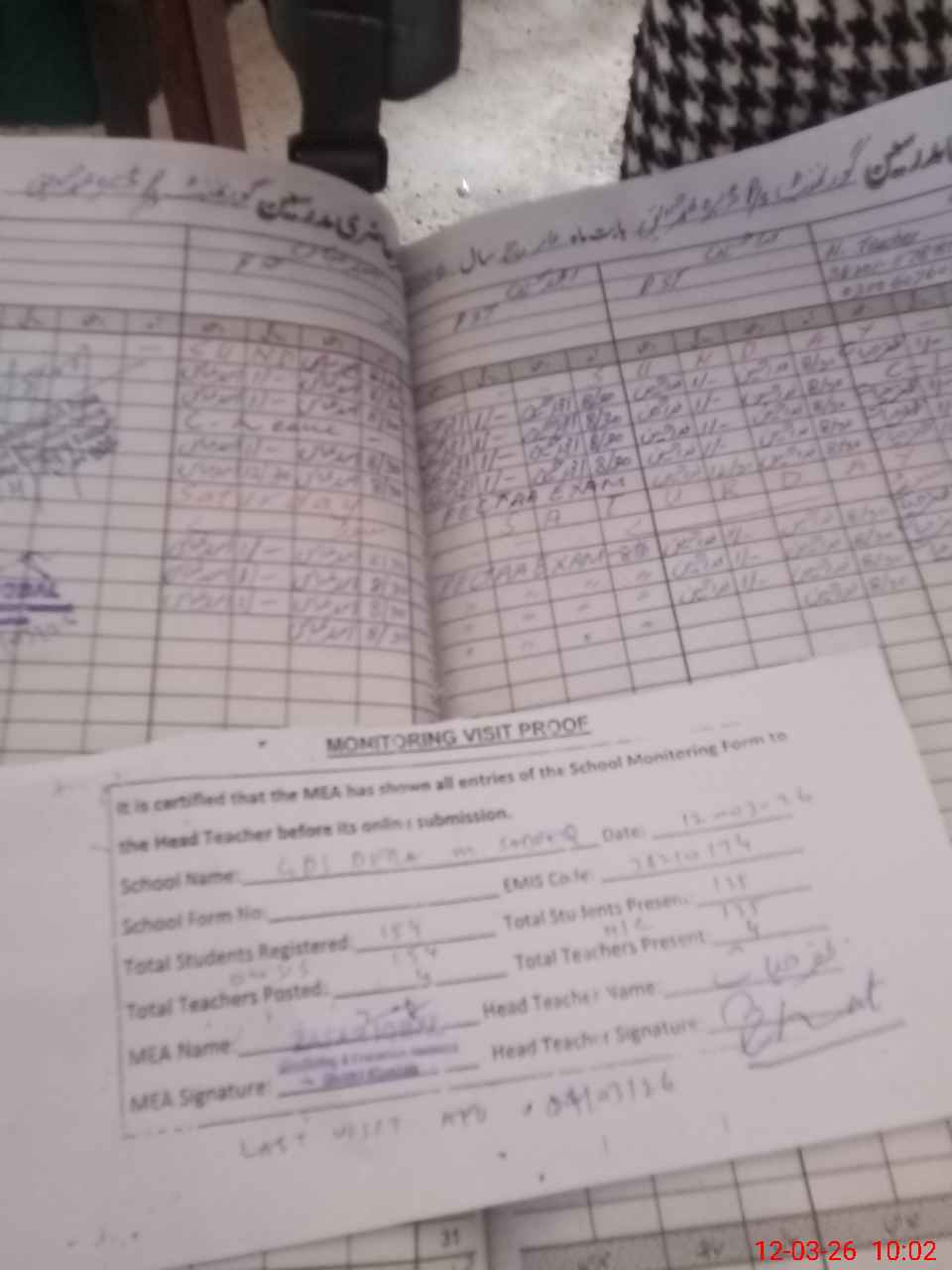 | Attendance Register | Head Teacher | MEA with School | Visit Proof |