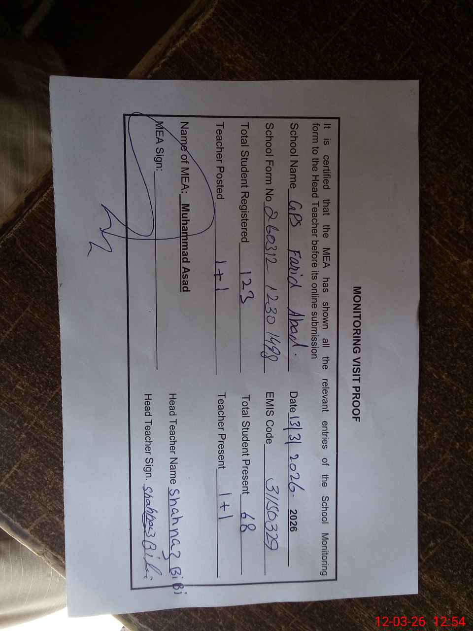 | EMIS Code: 31150329 | Name of School: GGPS FARID ABAD | |||