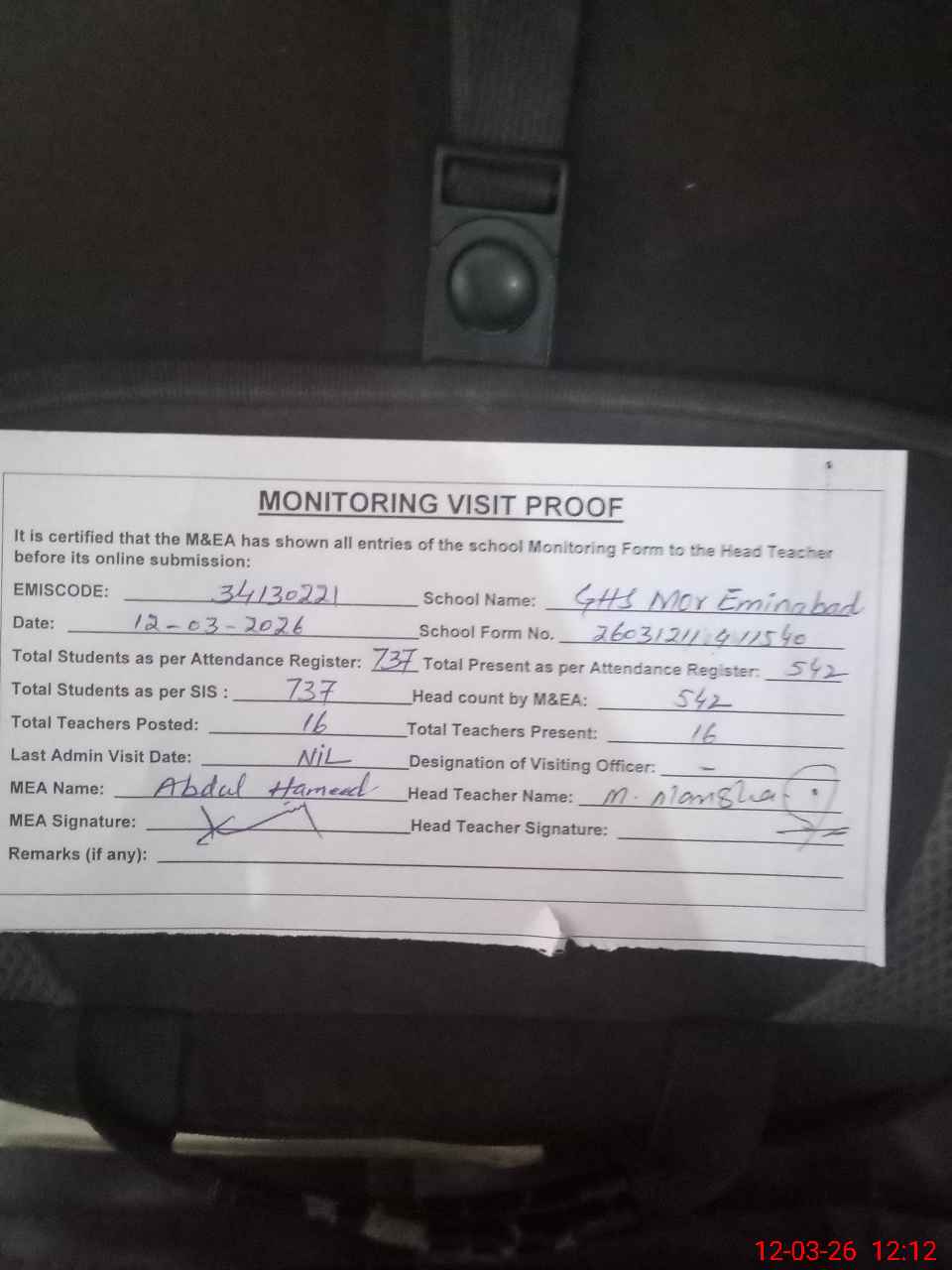 | Attendance Register | Head Teacher | MEA with School | Visit Proof |