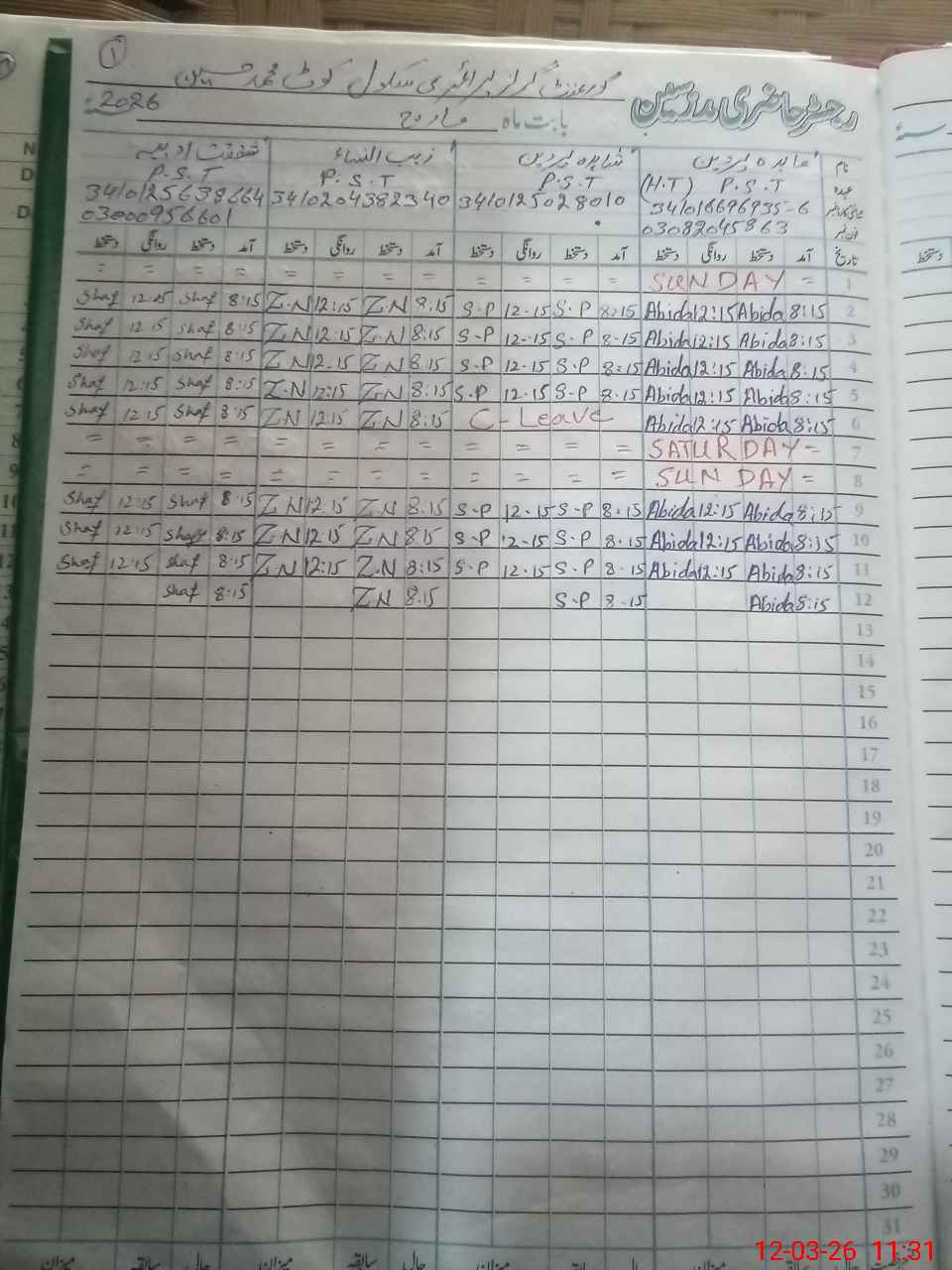 | CNIC | Full Name | Designation | R/C | Absence During Last Calender Month |