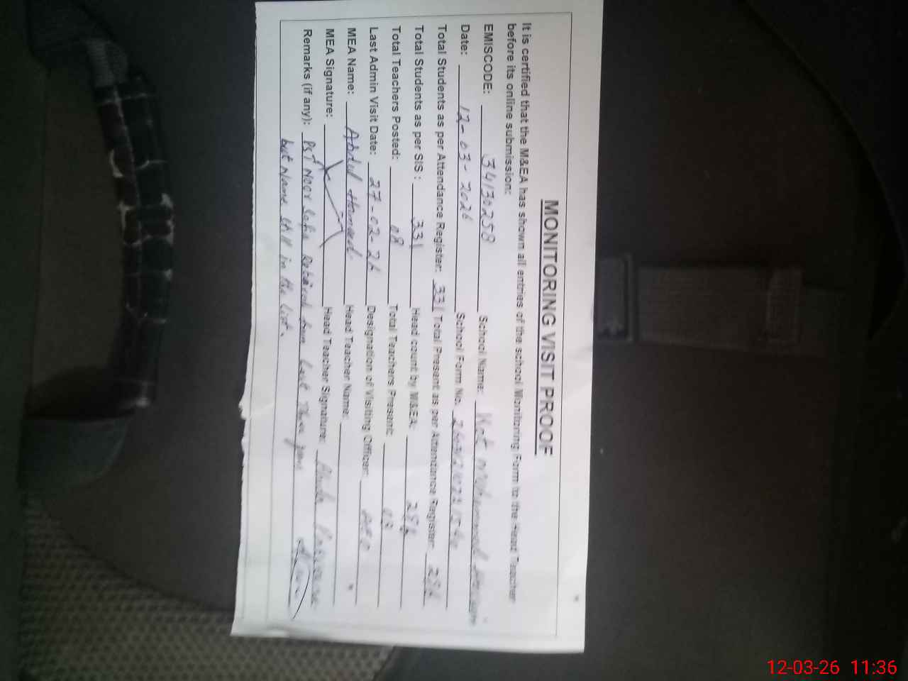 | Attendance Register | Head Teacher | MEA with School | Visit Proof |