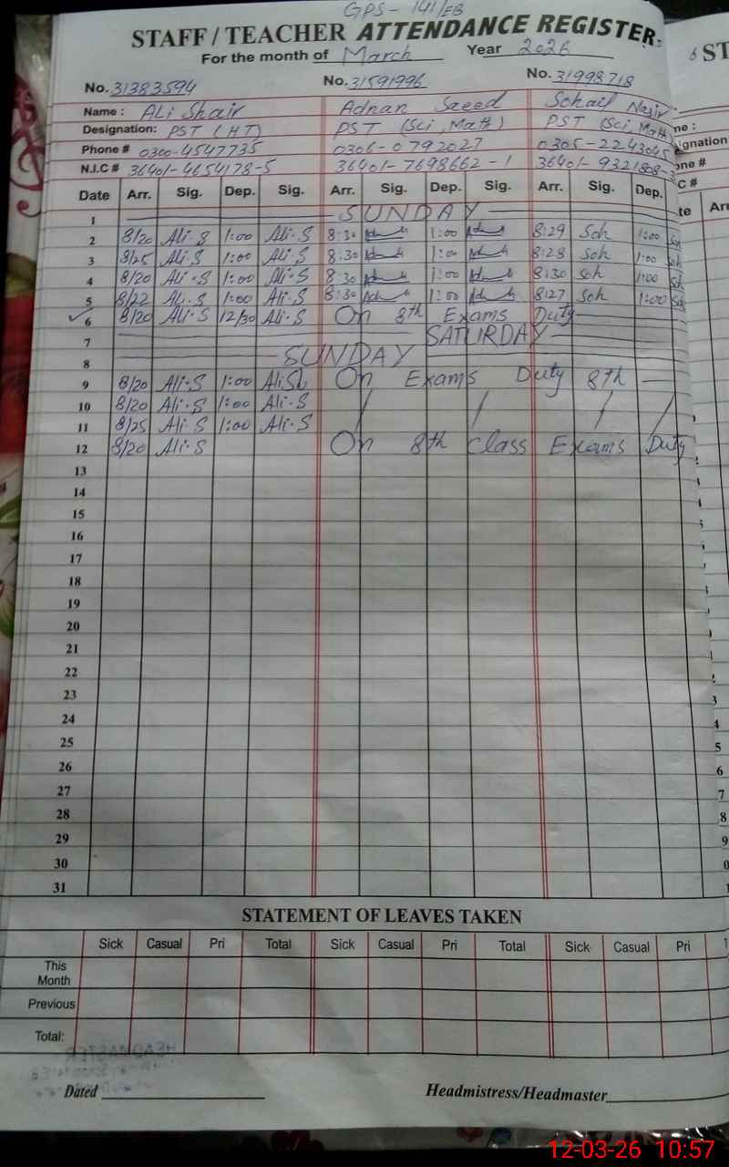 | 36**** | Ad**** Sa**** | PST Science/Maths | Regular | 0 | 0 | 0 | 0 | 0 | 0 | 0 | 0 | 0 | Exam Duty |