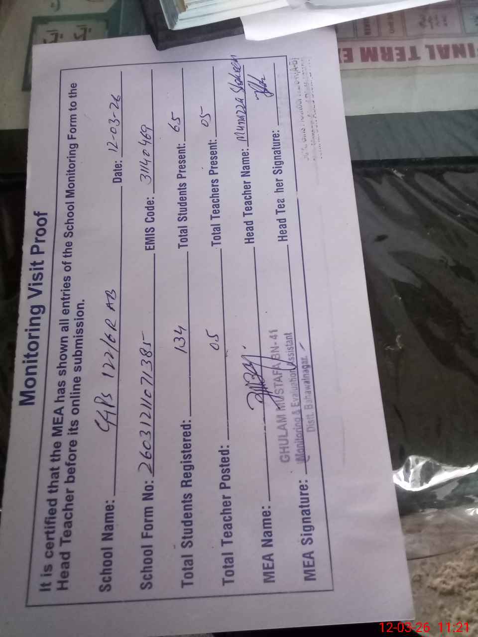 | Attendance Register | Head Teacher | MEA with School | Visit Proof |