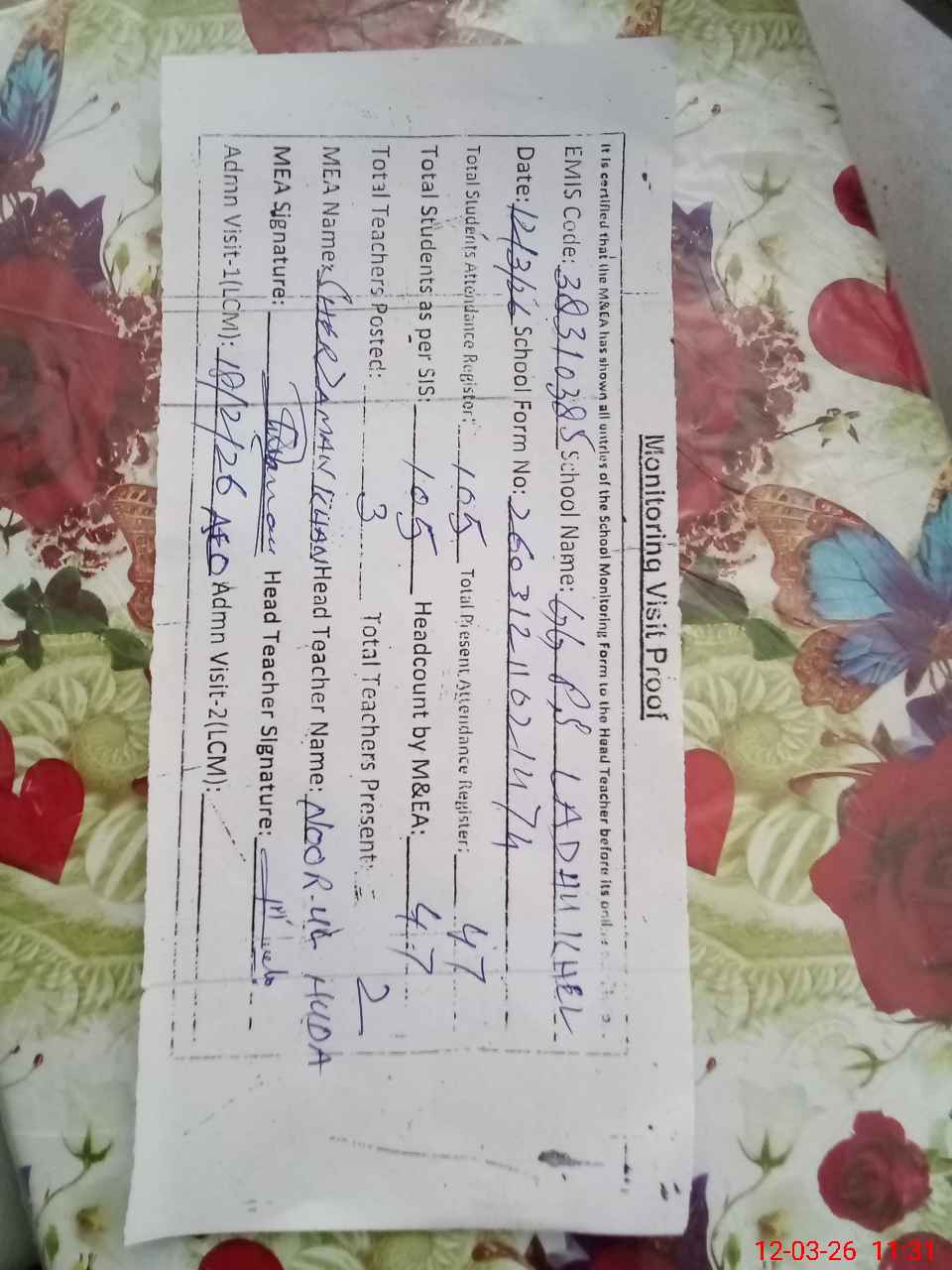 | Attendance Register | Head Teacher | MEA with School | Visit Proof |