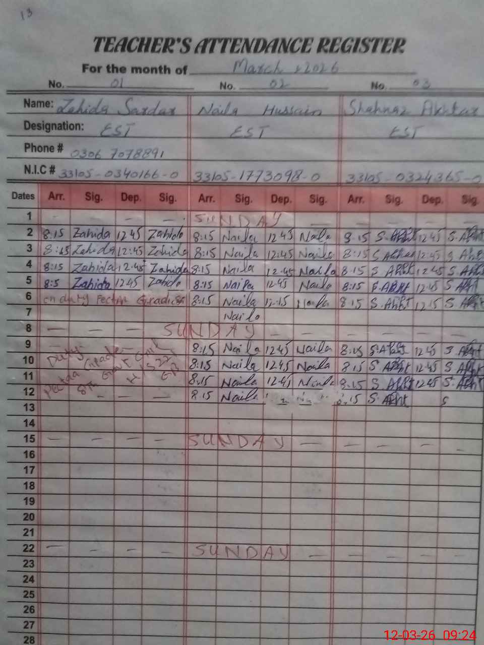 | Remarks (Use Separate Page if Required): class 8 have 37 students gone for exams to 213 GGHS.class 2 have 19 students not present due to no exams today | |||||