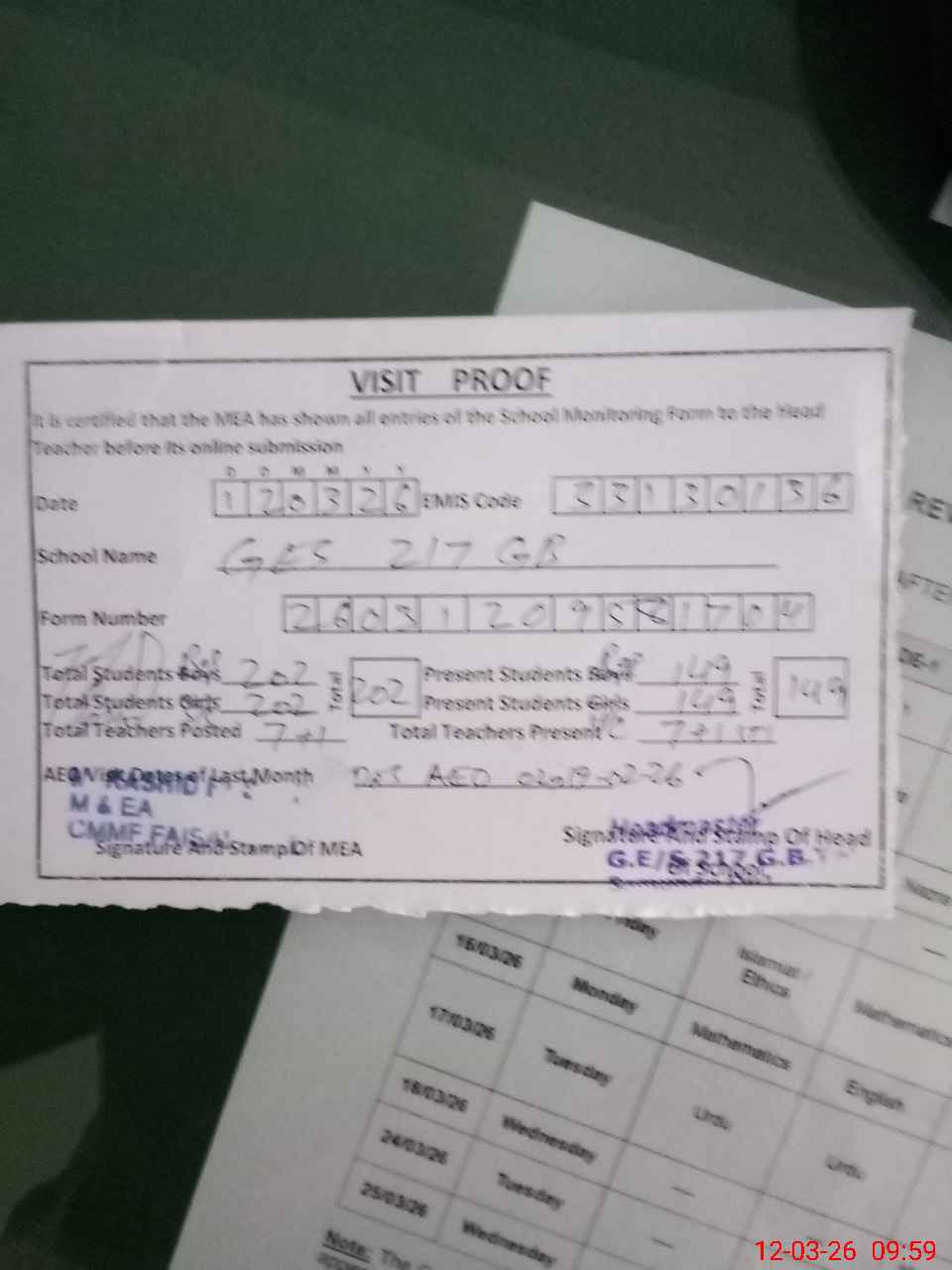 | Attendance Register | Head Teacher | MEA with School | Visit Proof |