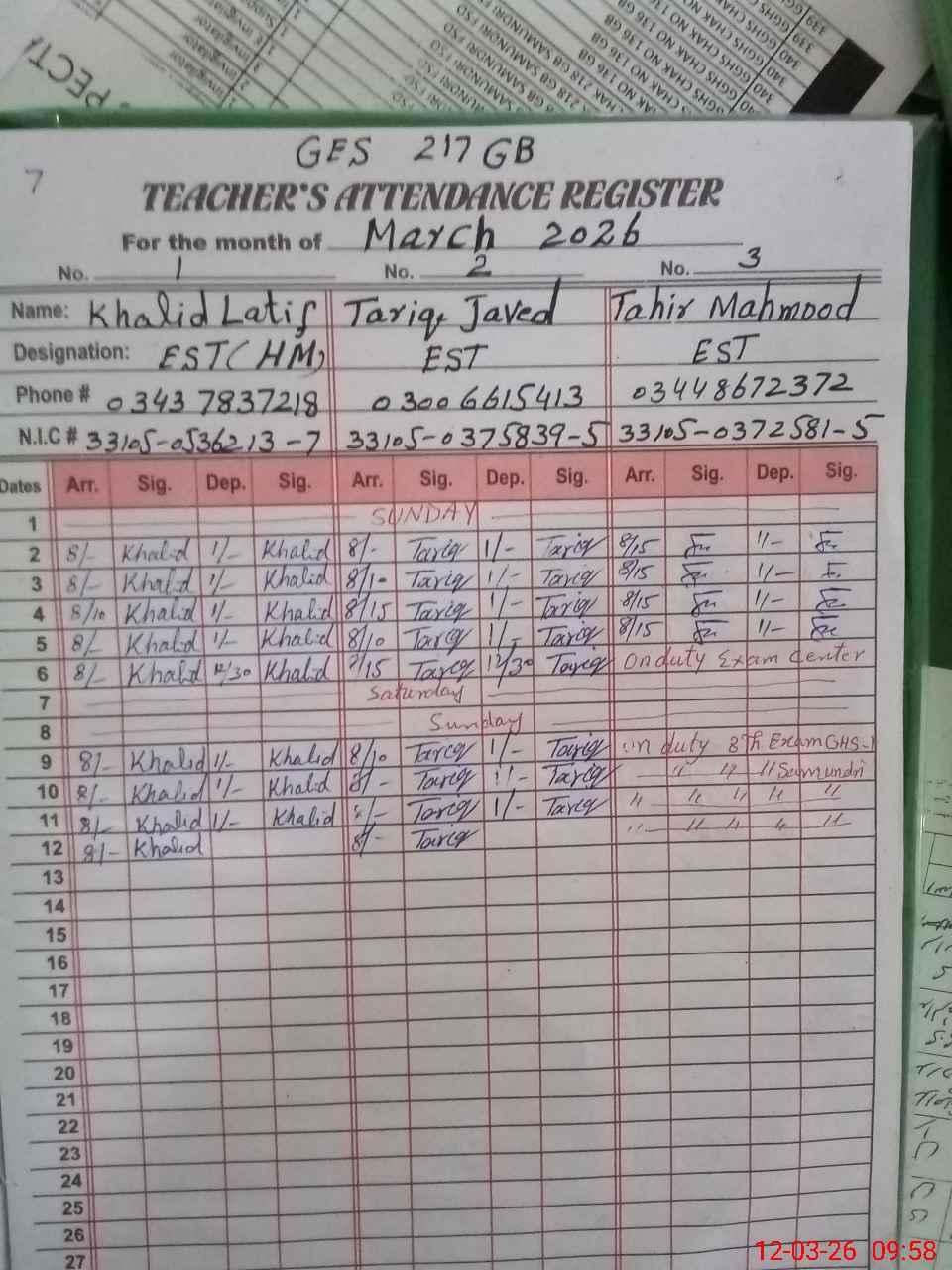 | 33**** | Kh**** La**** Wa**** | EST Urdu | Regular | 0 | 0 | 0 | 0 | 0 | 0 | 0 | 0 | 0 | Exam Duty |