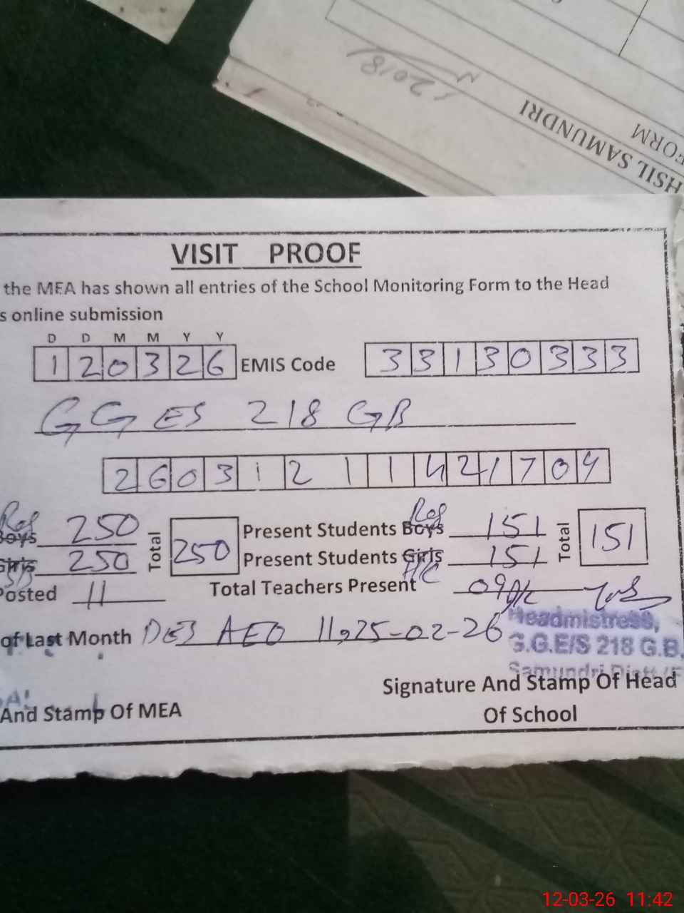 | Attendance Register | Head Teacher | MEA with School | Visit Proof |