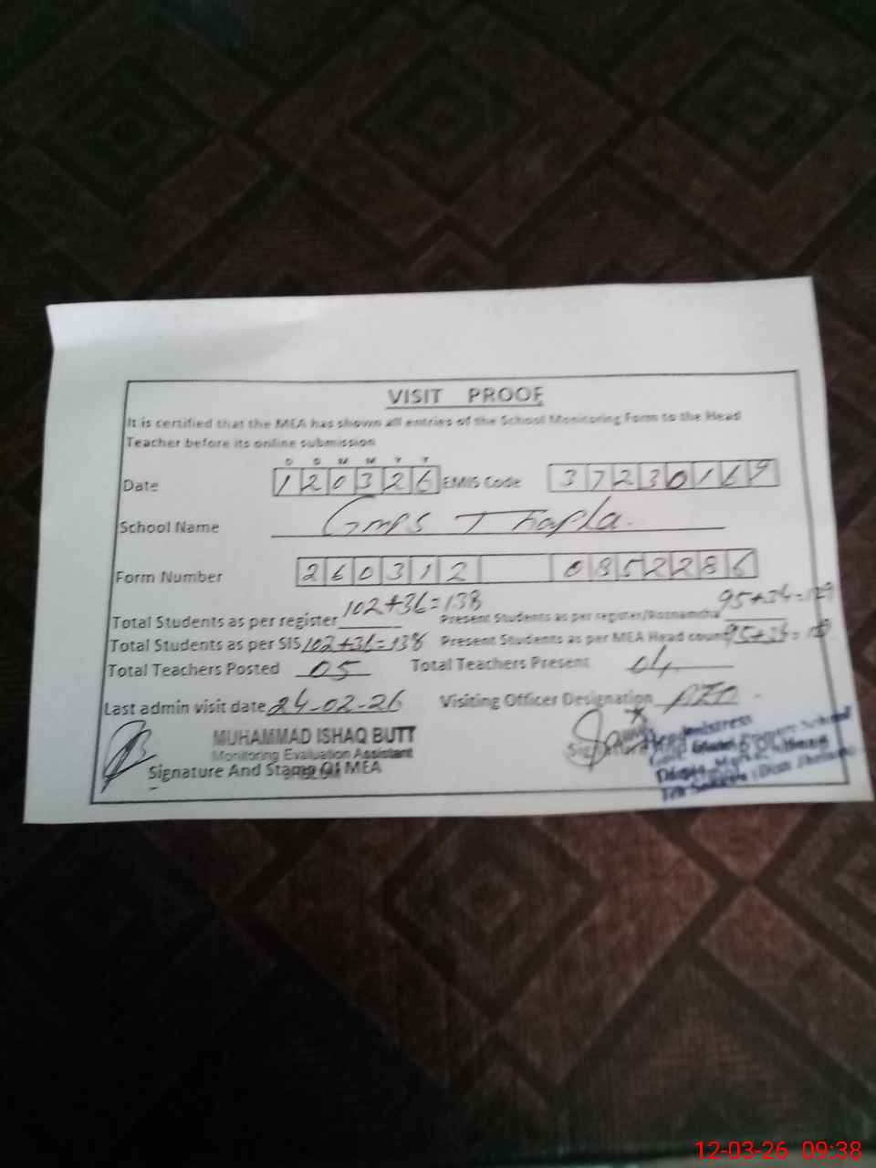 | Attendance Register | Head Teacher | MEA with School | Visit Proof |