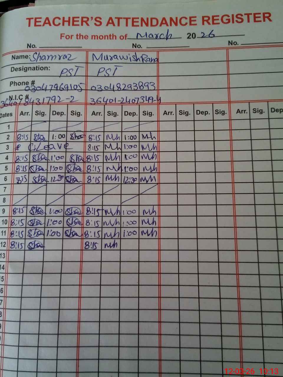 | CNIC | Full Name | Designation | R/C | Absence During Last Calender Month |