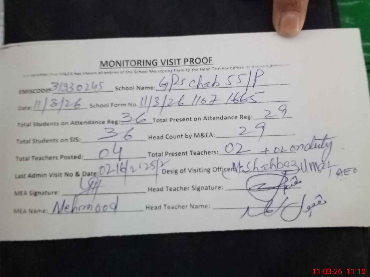 | Attendance Register | Head Teacher | MEA with School | Visit Proof |