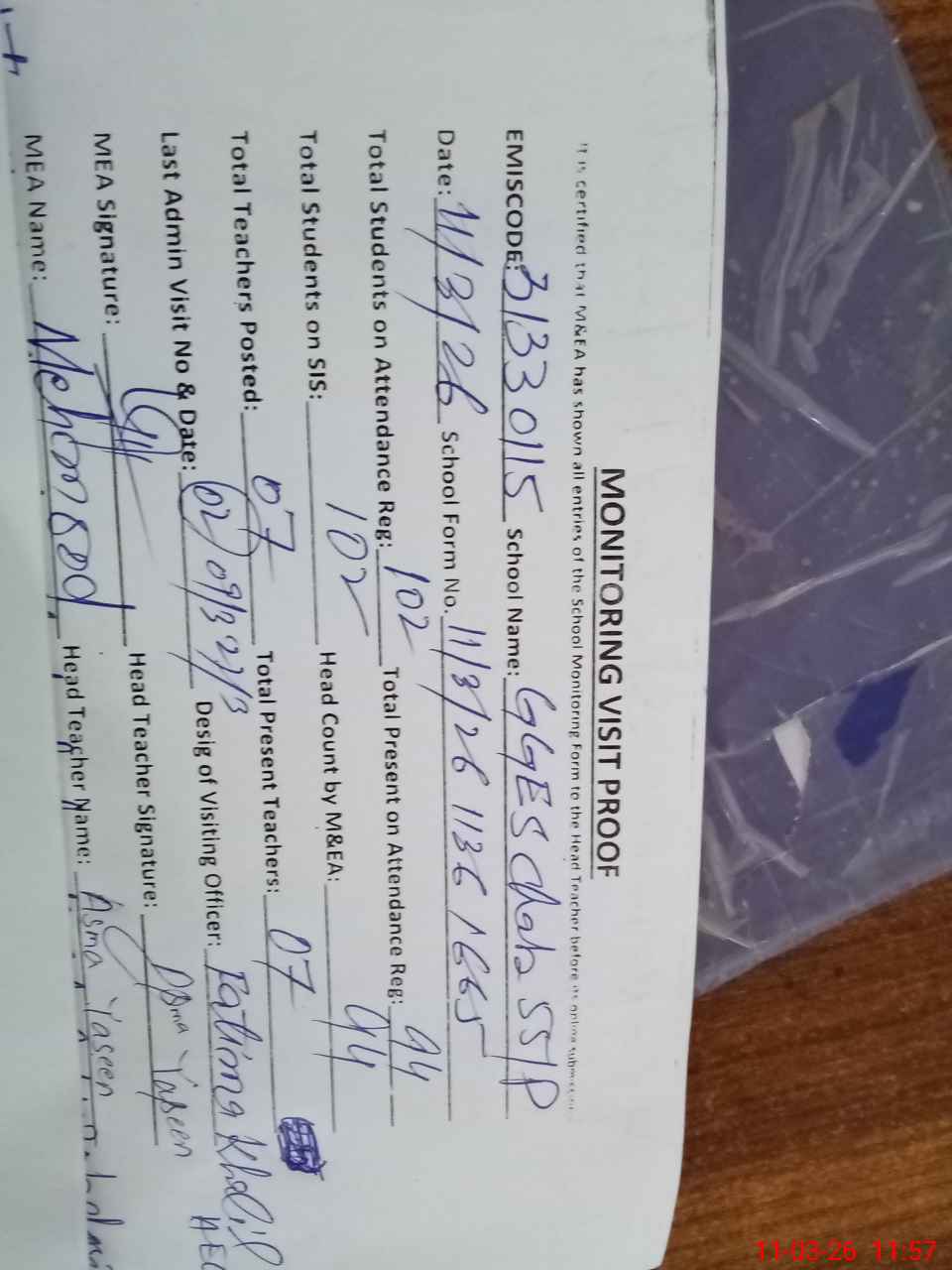 | Attendance Register | Head Teacher | MEA with School | Visit Proof |