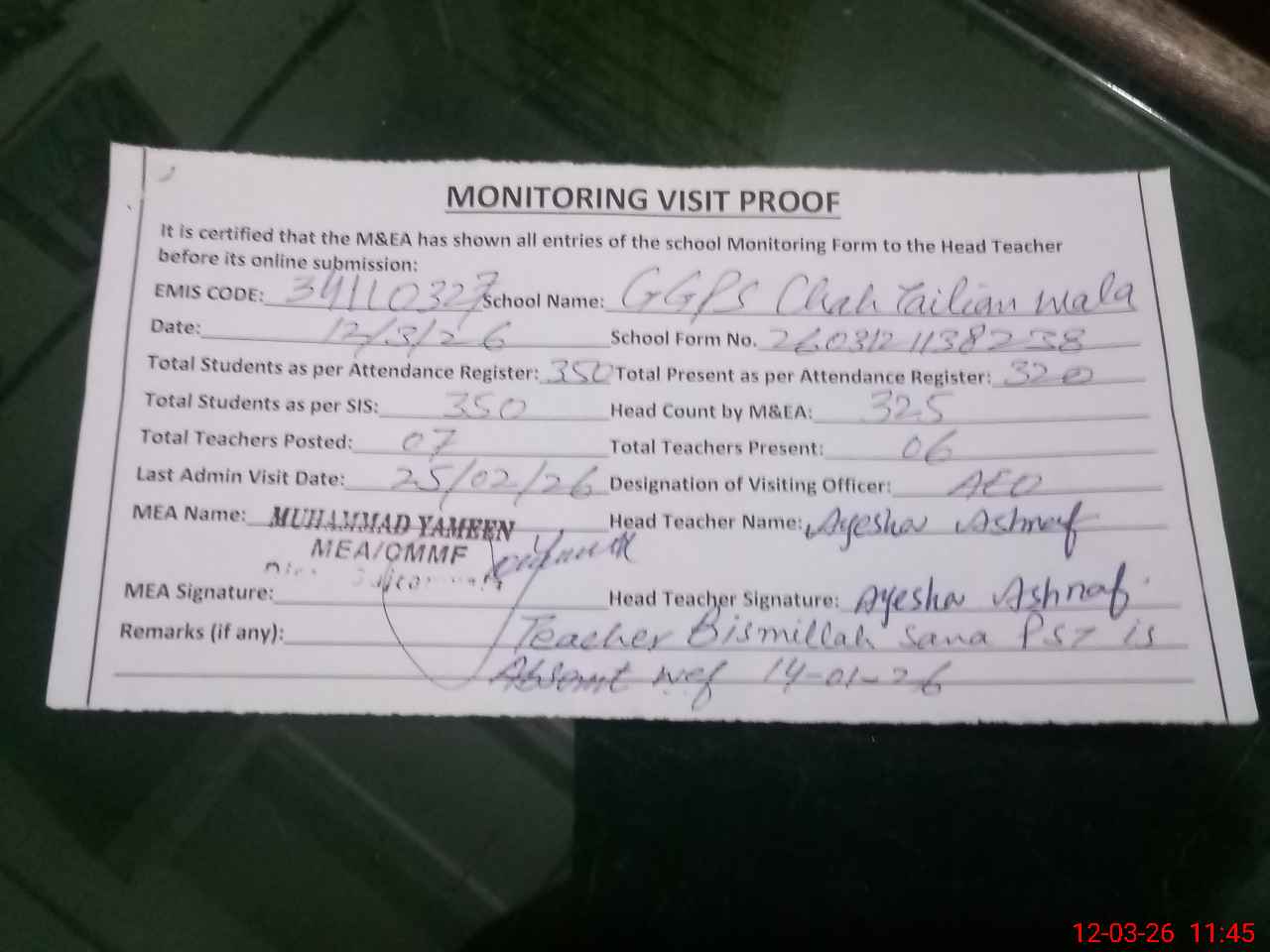 | Attendance Register | Head Teacher | MEA with School | Visit Proof |