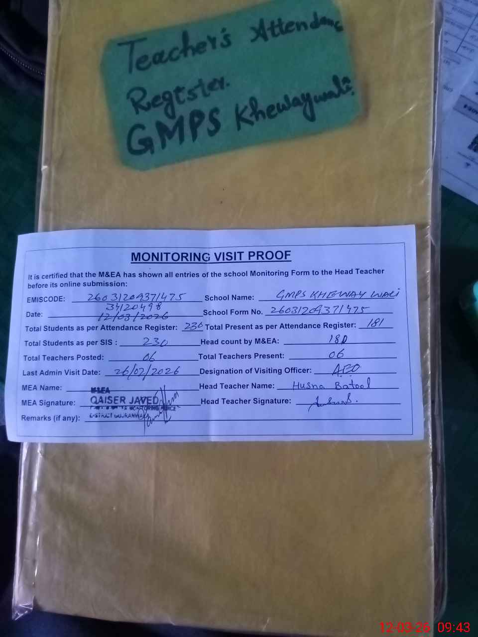 | Attendance Register | Head Teacher | MEA with School | Visit Proof |