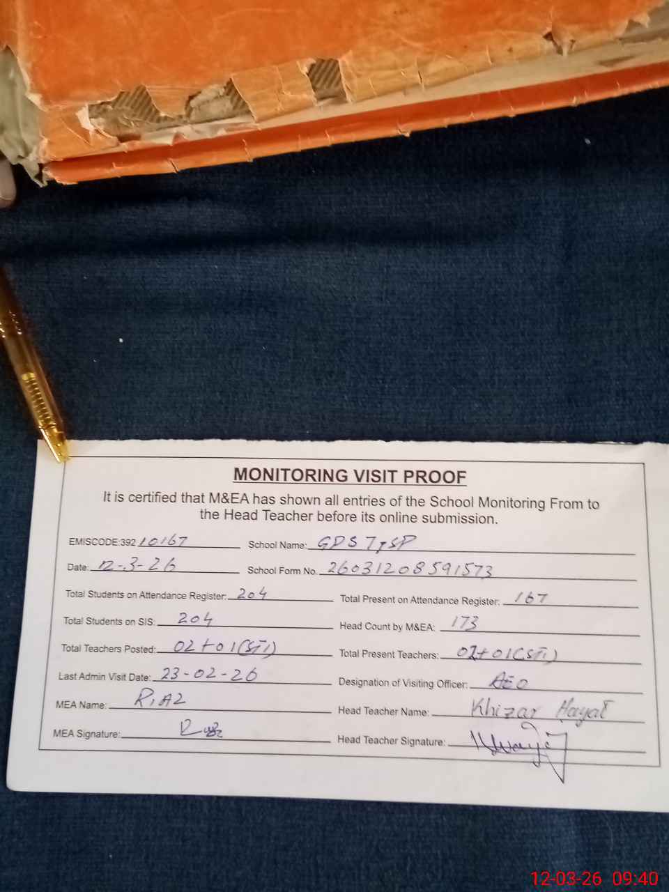 | Attendance Register | Head Teacher | MEA with School | Visit Proof |