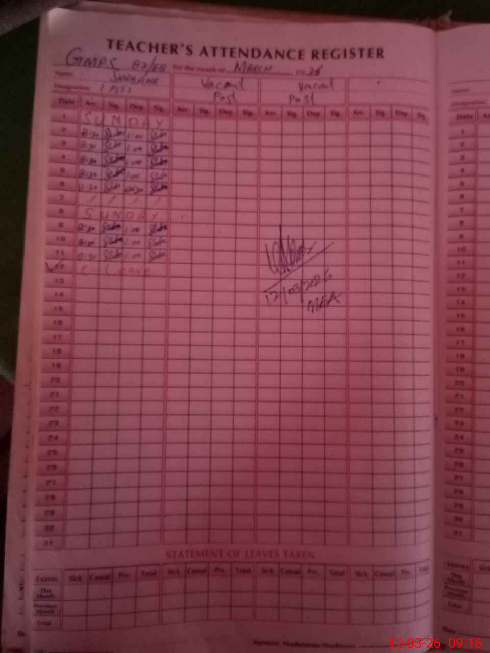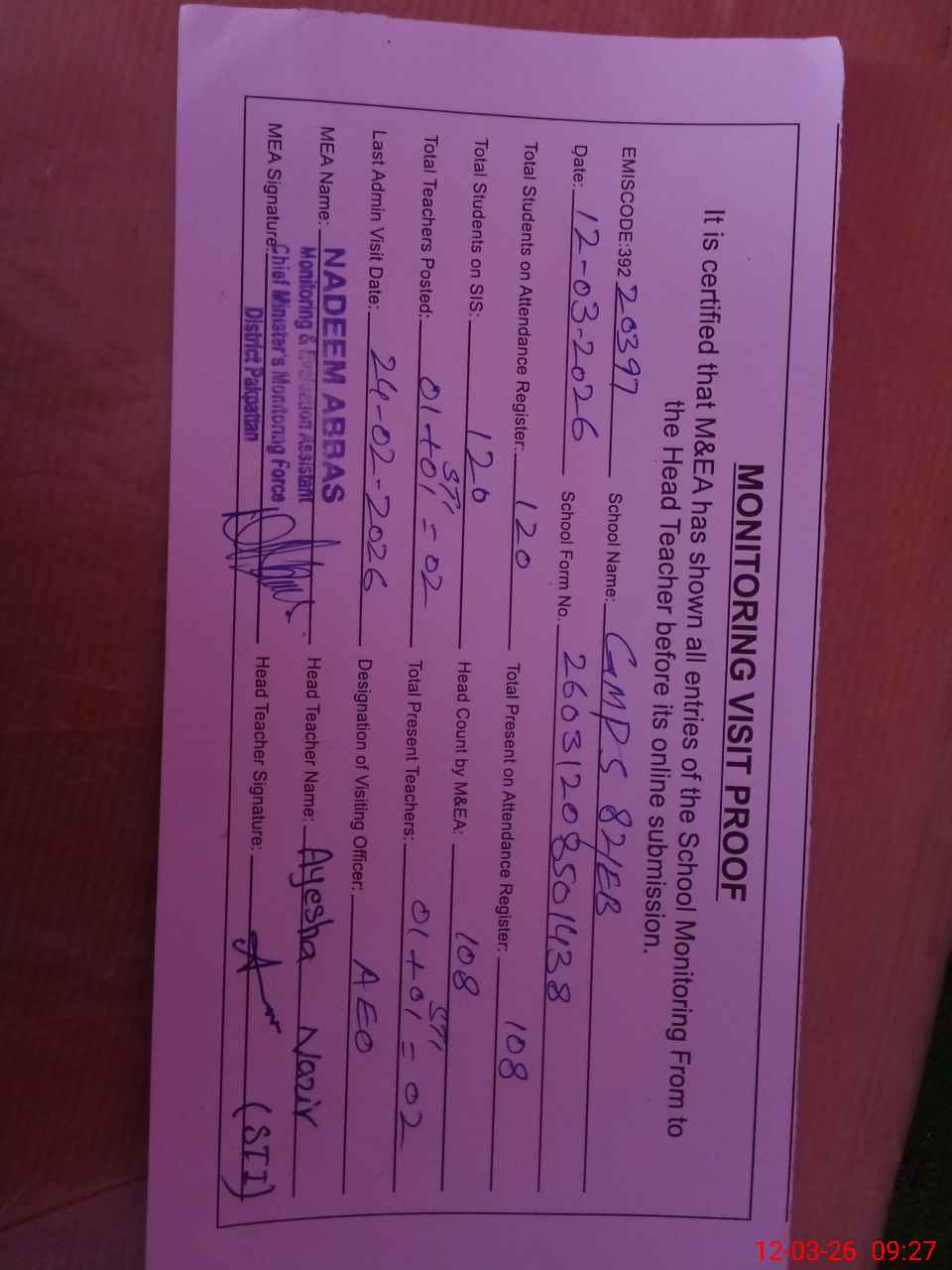 | Attendance Register | Head Teacher | MEA with School | Visit Proof |
