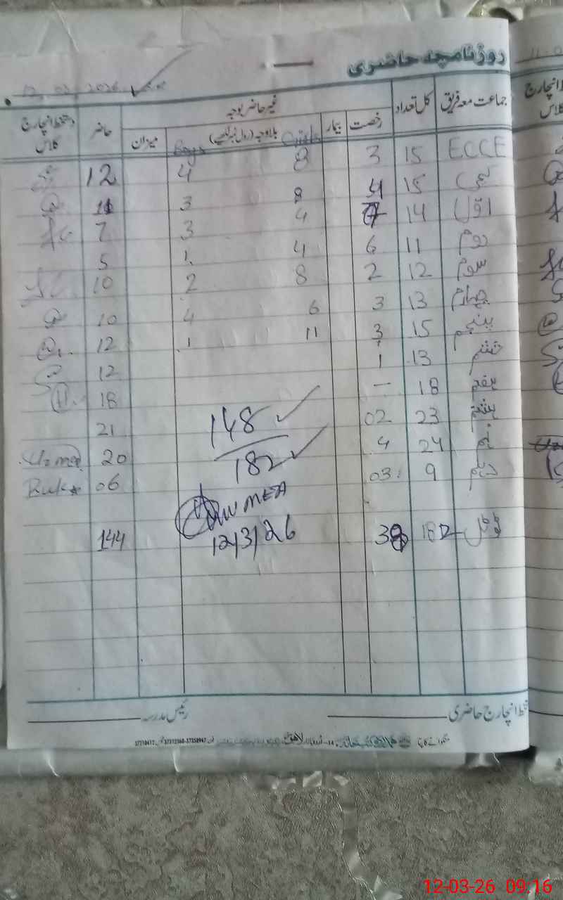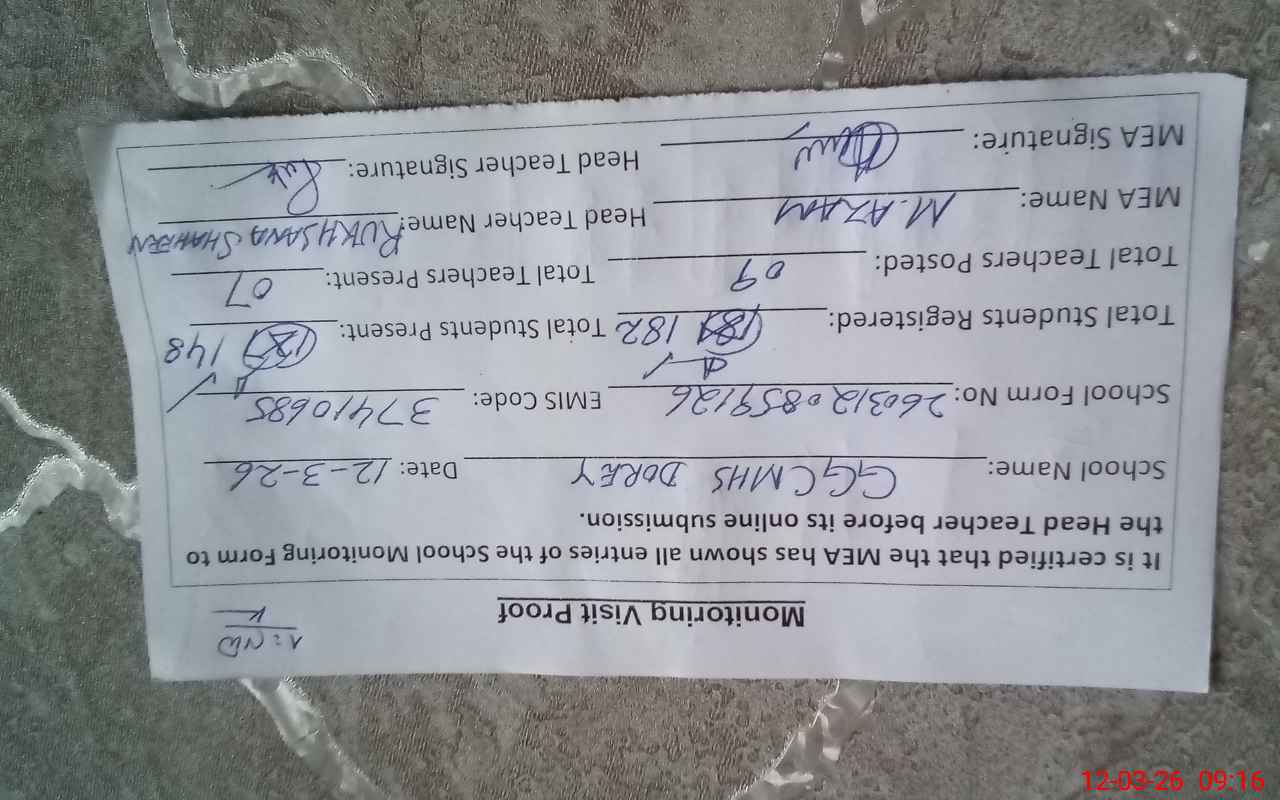 | Remarks (Use Separate Page if Required): Violation of Punjab SED letter dated 09/03/2026: Kachi, Class 2, 9th and 10th students present in the school during monitoring visit but today no paper of these classes scheduled. No admin visit in February 2026. | |||||