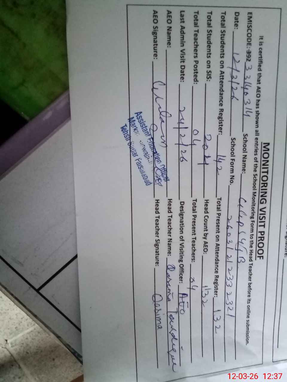 | Attendance Register | Head Teacher | MEA with School | Visit Proof |