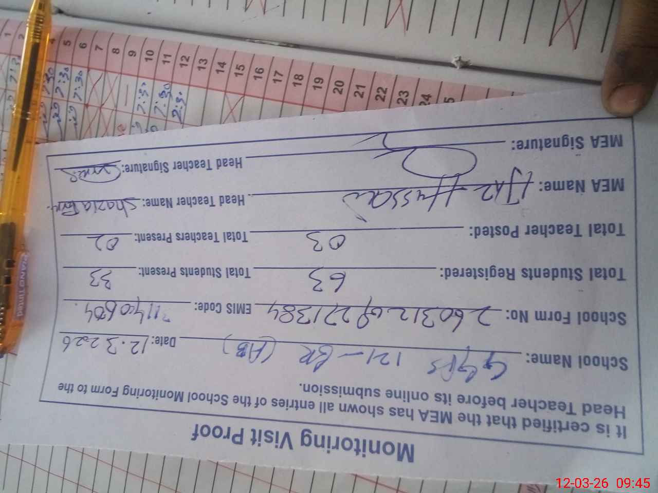 | Attendance Register | Head Teacher | MEA with School | Visit Proof |
