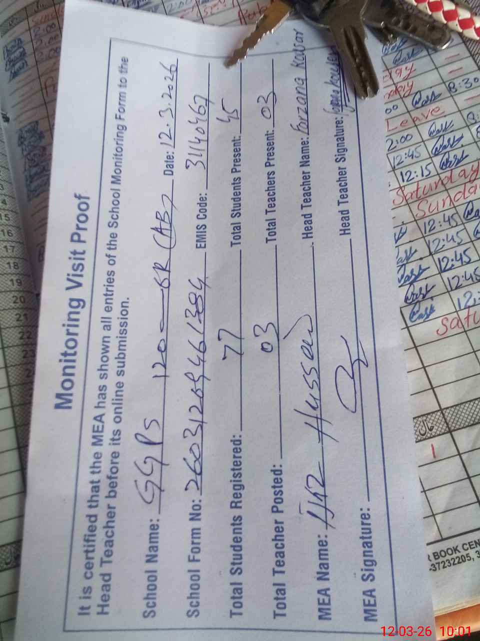 | Attendance Register | Head Teacher | MEA with School | Visit Proof |