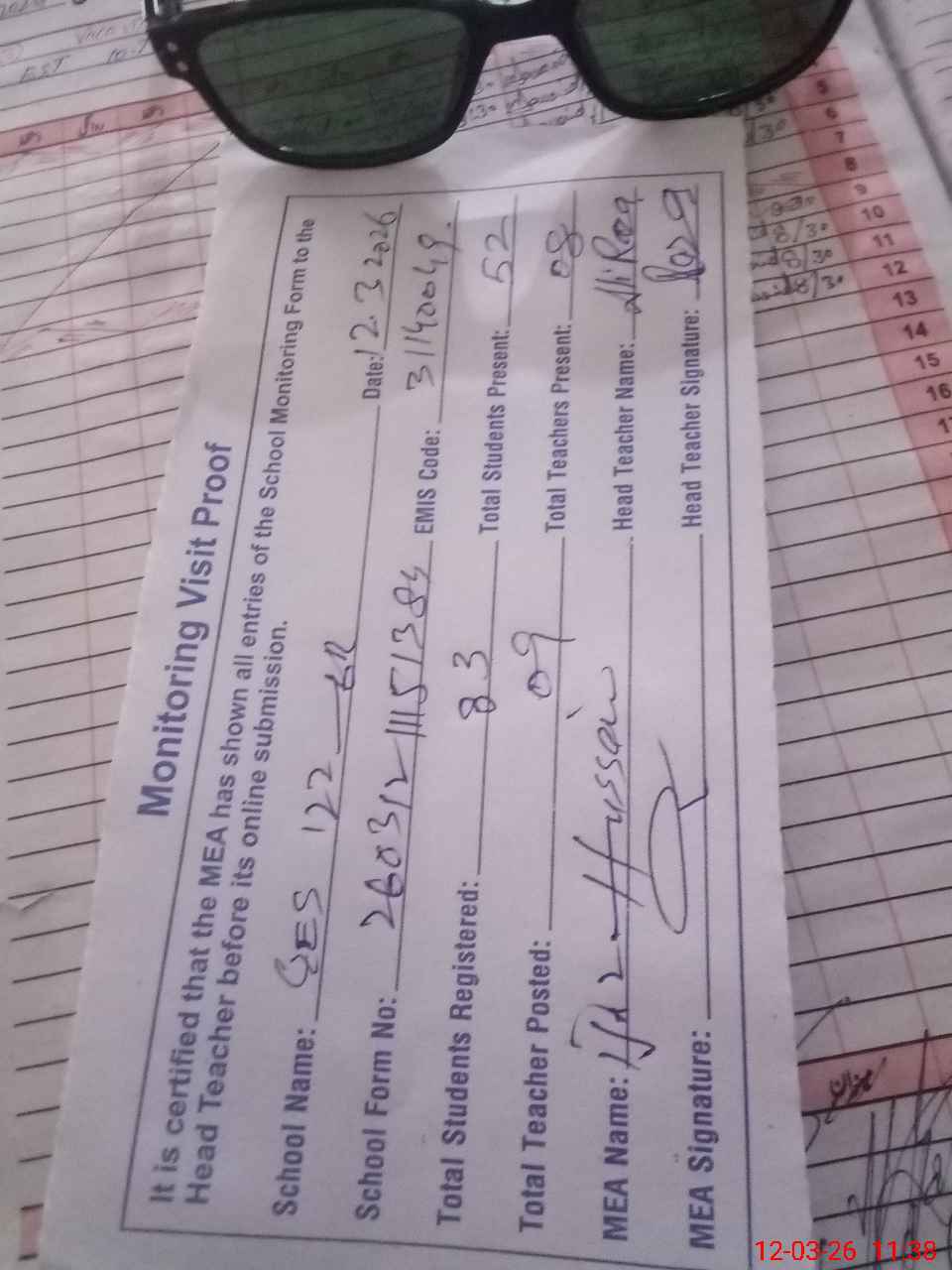 | Attendance Register | Head Teacher | MEA with School | Visit Proof |