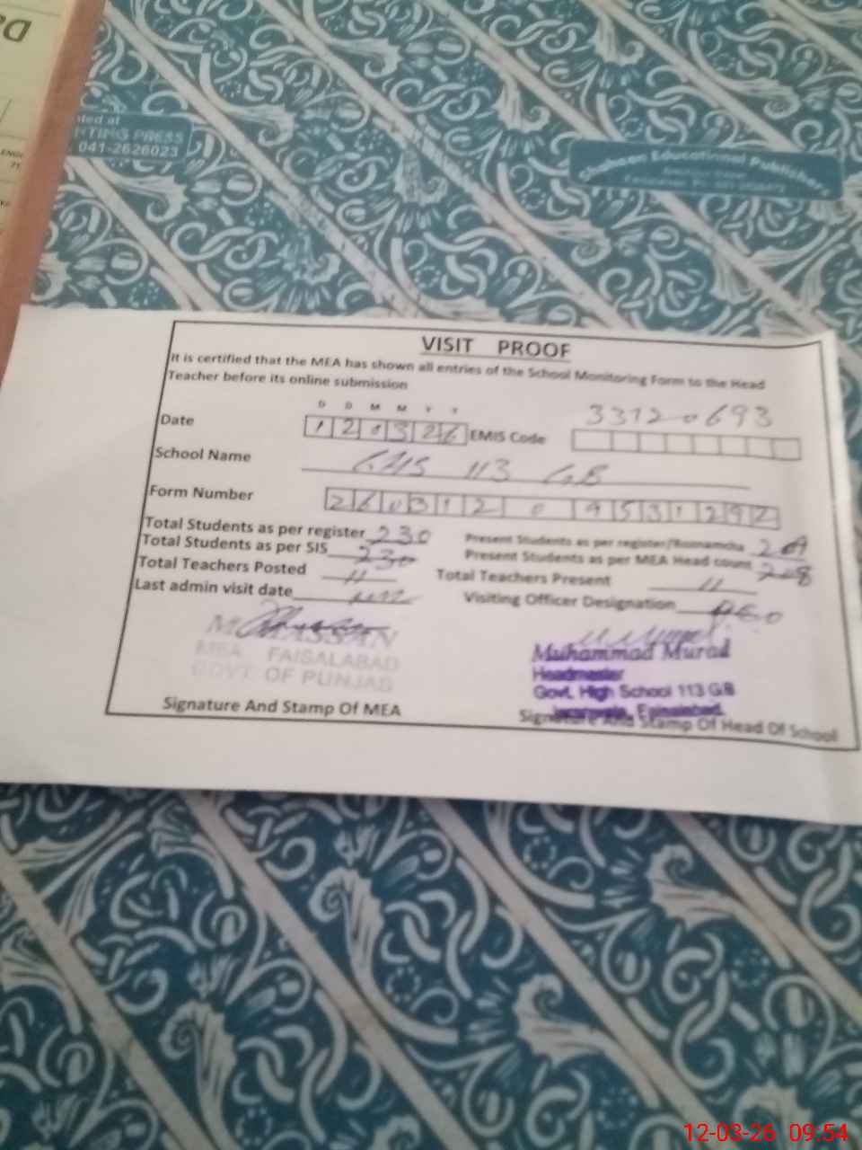 | EMIS Code: 33120693 | Name of School: GHS CHAK NO 113 GB | |||